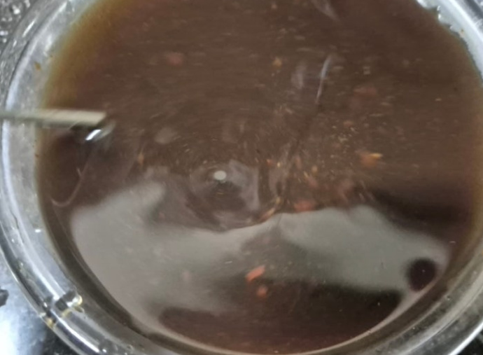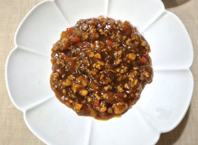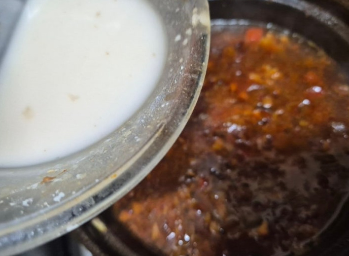 어향소스가 끓을 때 물전분에 물은 버리고 가라 앉은 전분만 골고루 넣고 잘~~저어요. 소스 농도, 간 체크 필수♡ 임셰프는 고추기름,후추 추가로 넣으셨어요.