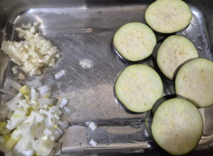 가지 1개에 6개가 만들어집니다. 대파는 흰부분만 작게 썰어요. 마늘도 입자가 있게 다져요.