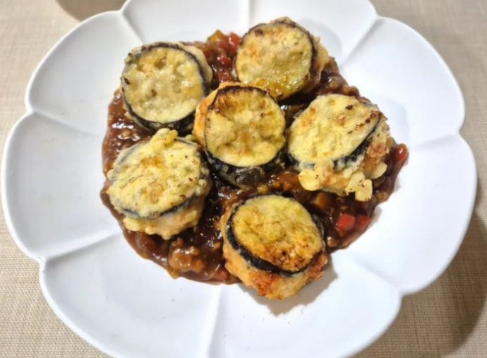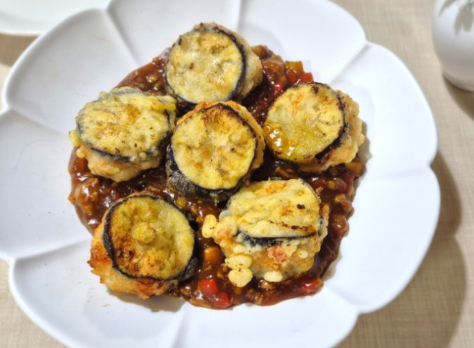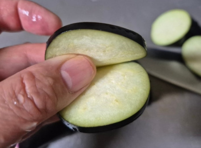 가지는 통통한 부위만 사용하고 반듯하게 잘라요. (어슷하게 자르면 튀김이 커짐) 칼집은 0.2cm 두께 처음에는 4/5지점 까지만 썰고 두번째는 컷팅을 합니다. 사진처럼 벌려지게 썰어요. v자형