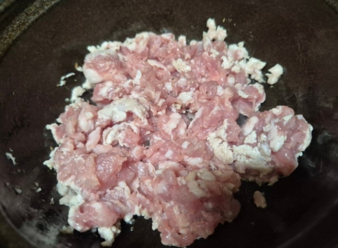 달군 팬에 참기름 10ml, 돼지고기 다짐육을 넣고 30초 볶아요. (소금,후추 살짝)