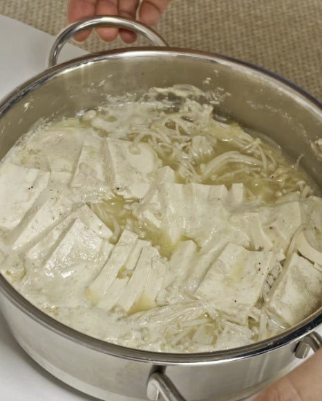 냄비에는 양파 → 팽이버섯 → 두부 순서대로 차곡차곡 올려줍니다.
