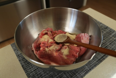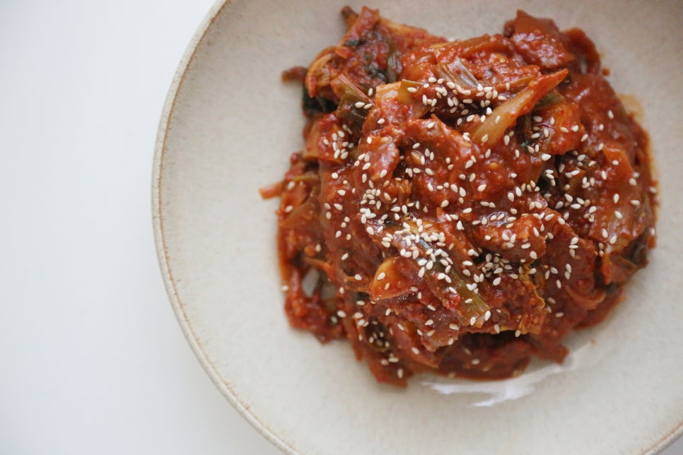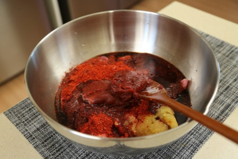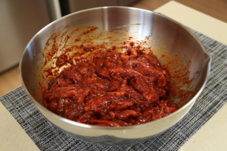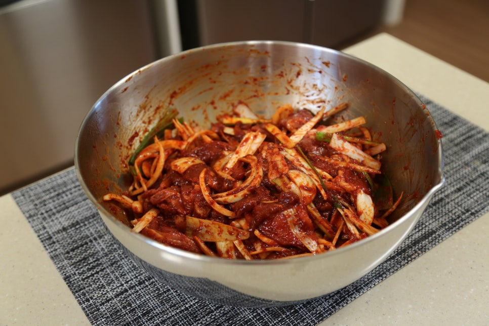 돼지고기 앞다리살 300g, 고춧가루 6스푼, 다진 마늘 2스푼, 양조간장 8스푼, 고추장 2스푼, 올리고당 4스푼