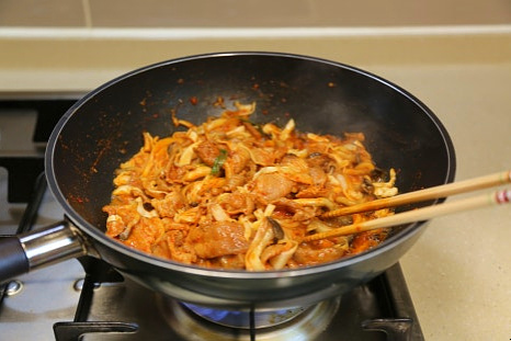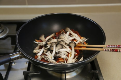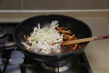식용유 4스푼, 양념한 돼지고기 300g, 느타리버섯 50g, 양배추 1/8통