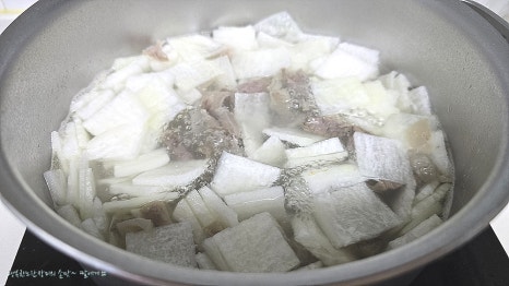 육수,고기 덜어서 무 썰어 넣고
