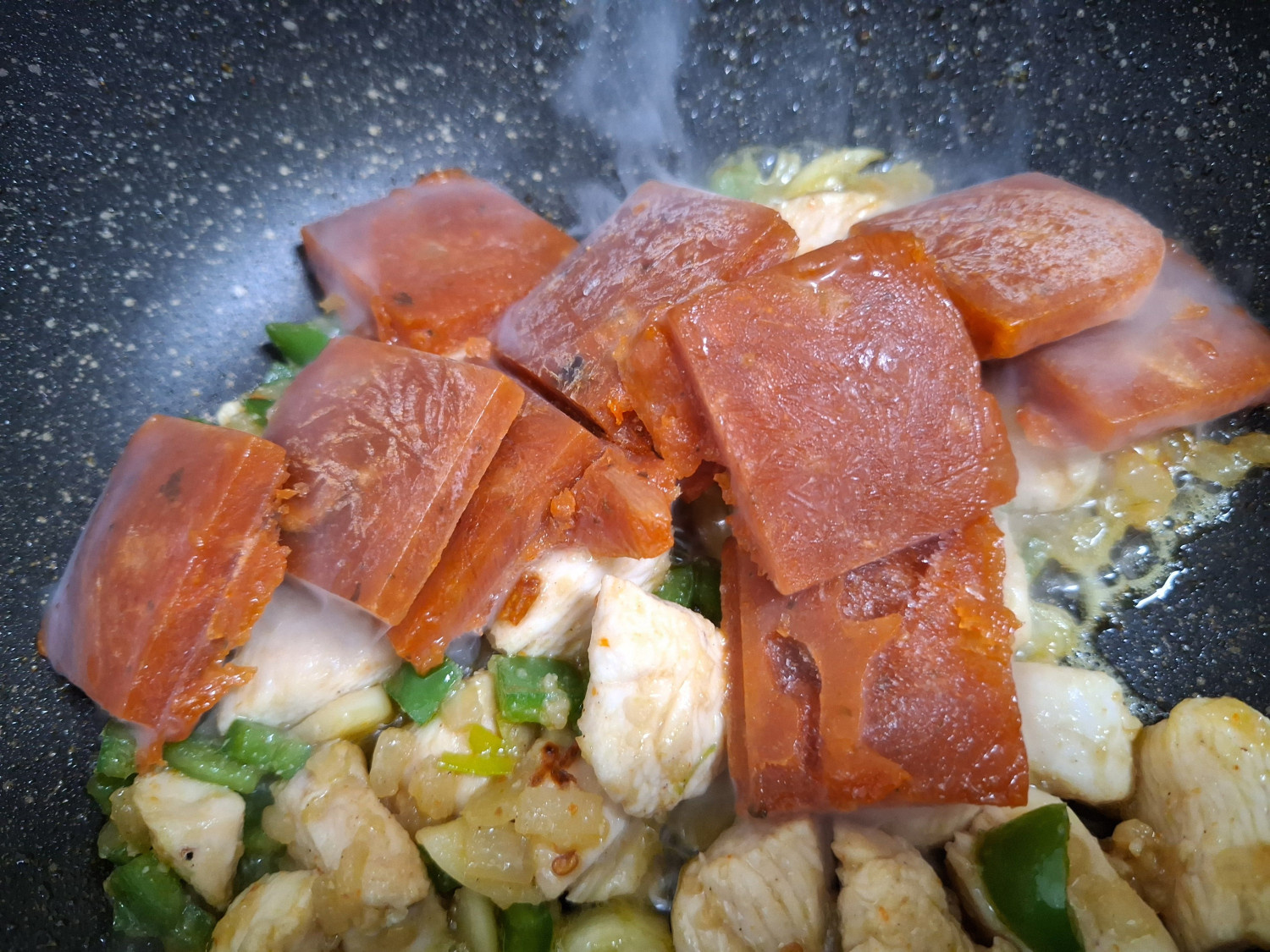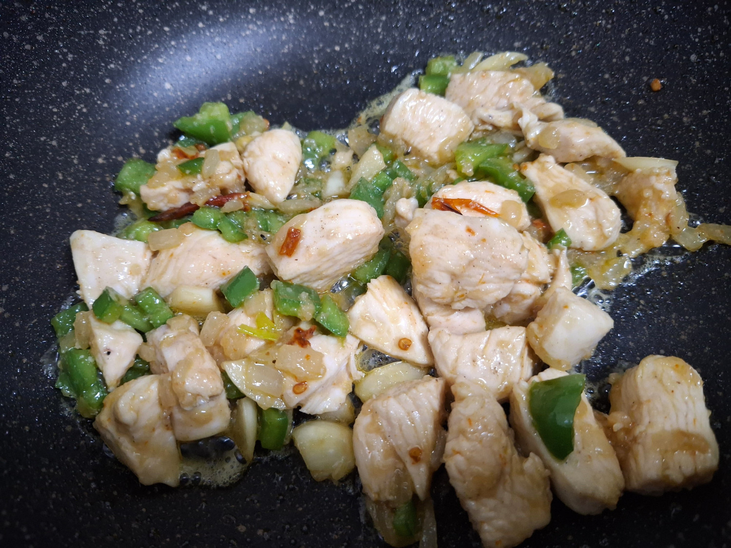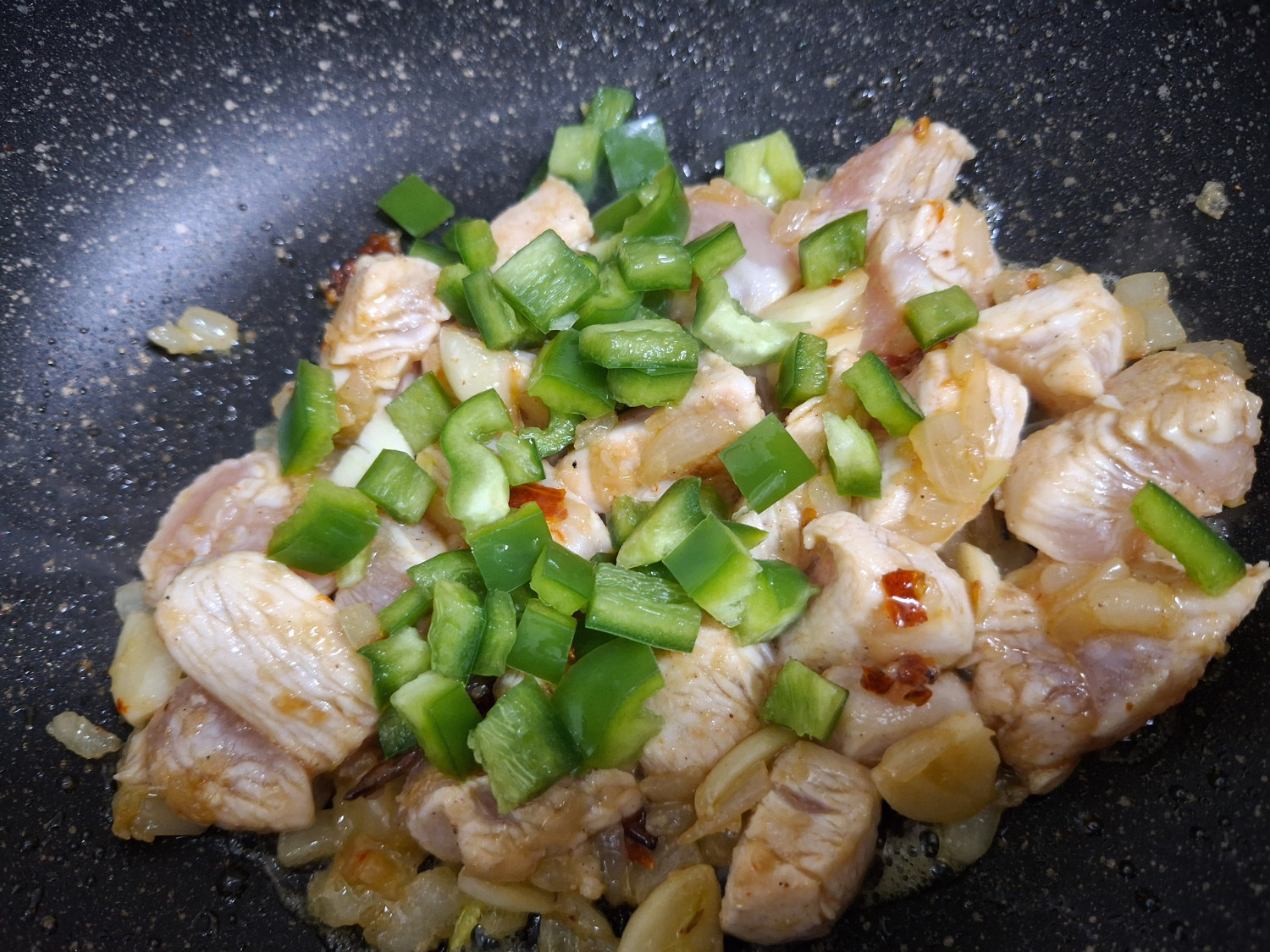 다진 피망을 넣고 닭가슴살이