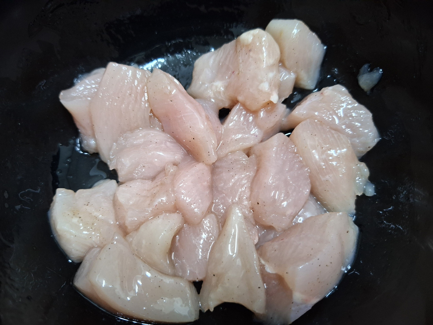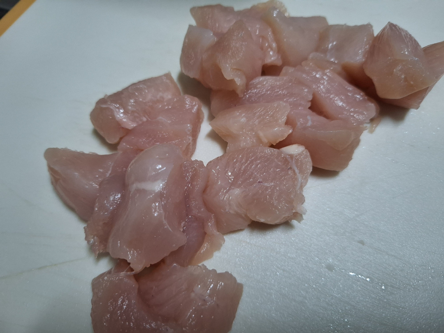 닭가슴살은 너무 크면 많이 퍽퍽하고 익는데도 오래걸리니까요. 작게 썰어주세요.