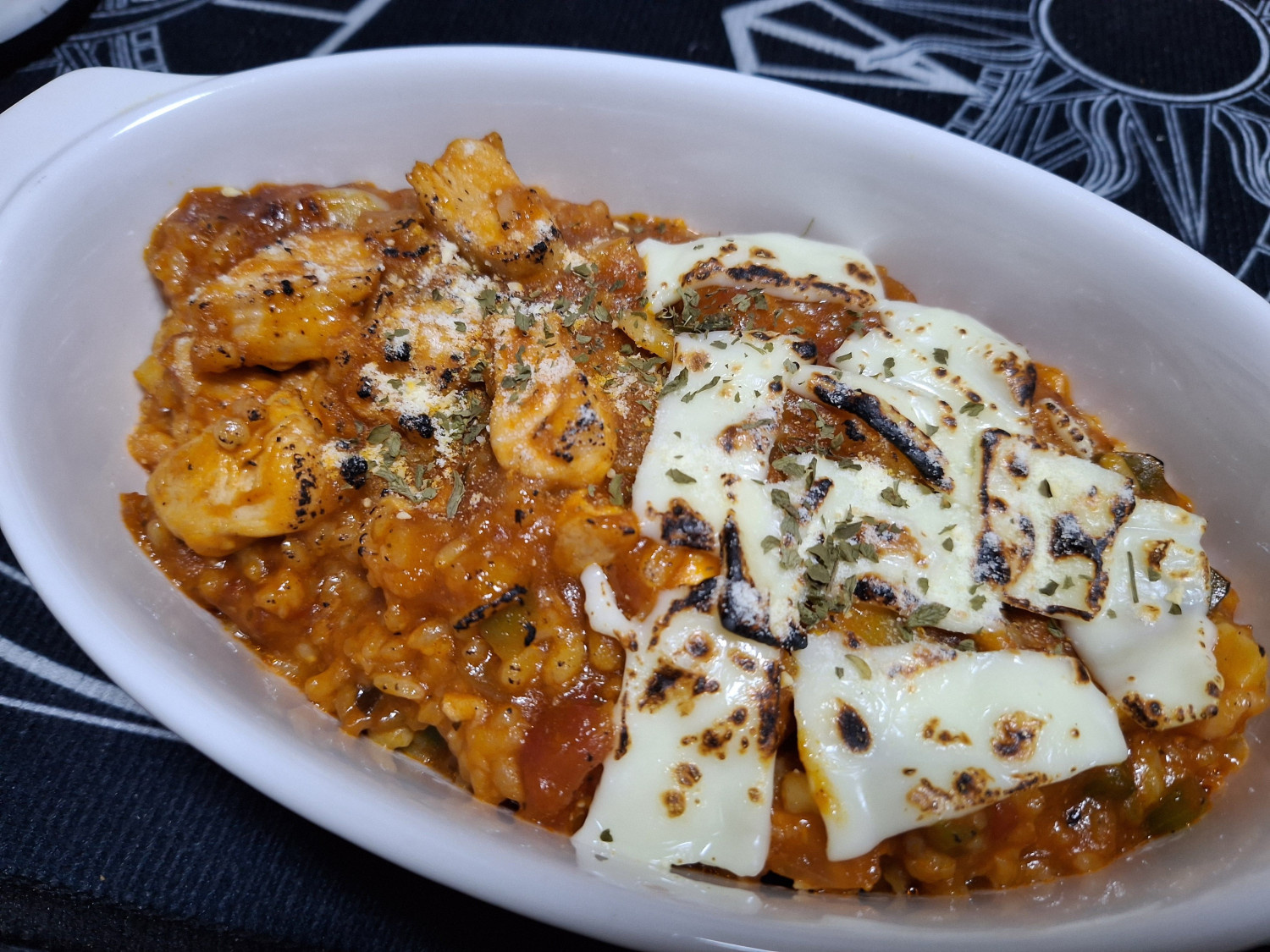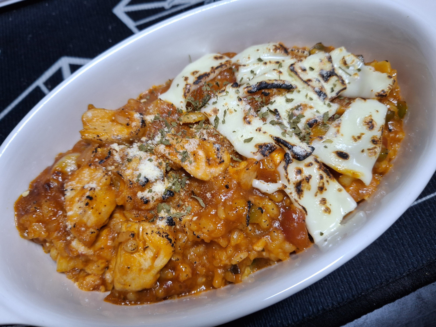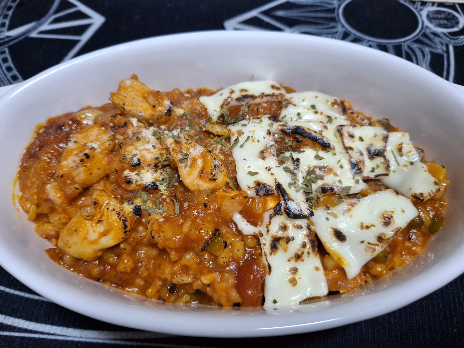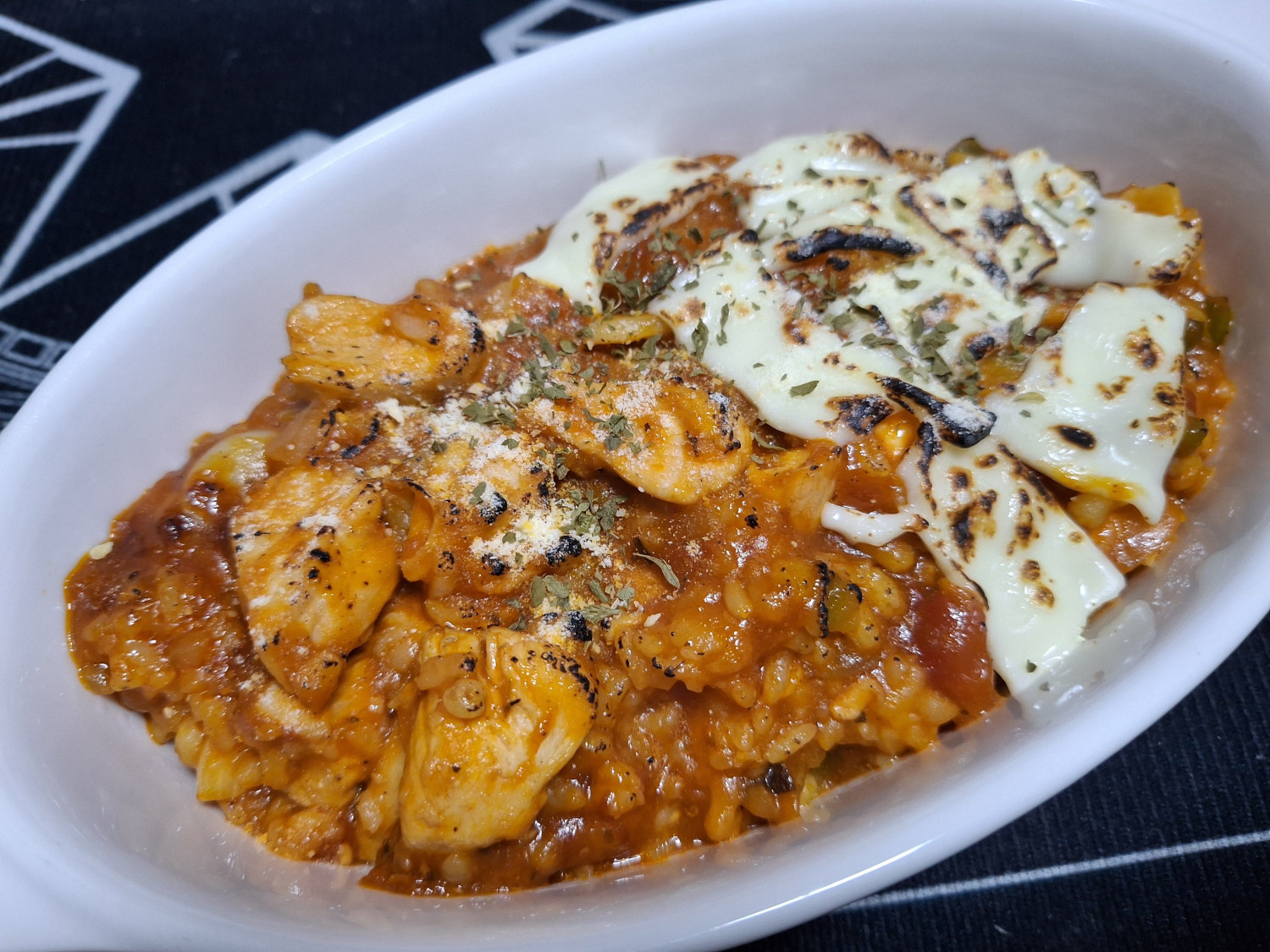 다 볶아진 닭가슴살토마토치즈리조또를 그릇에 담아줍니다.