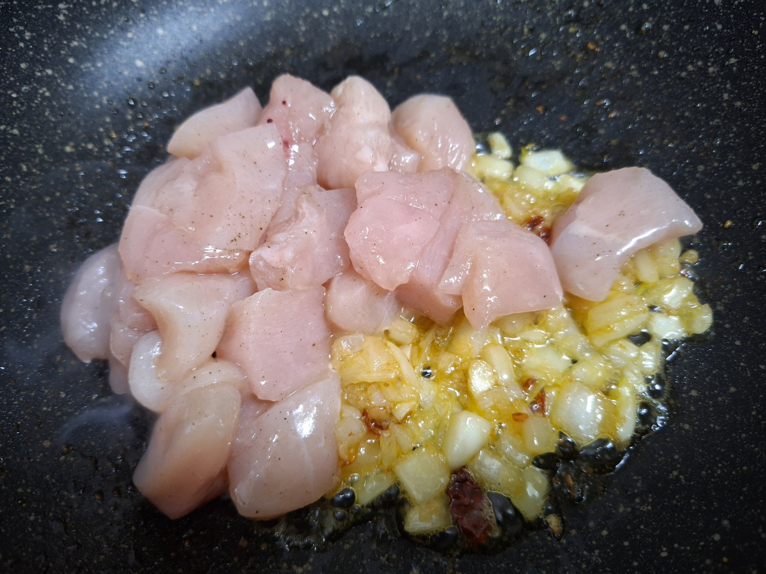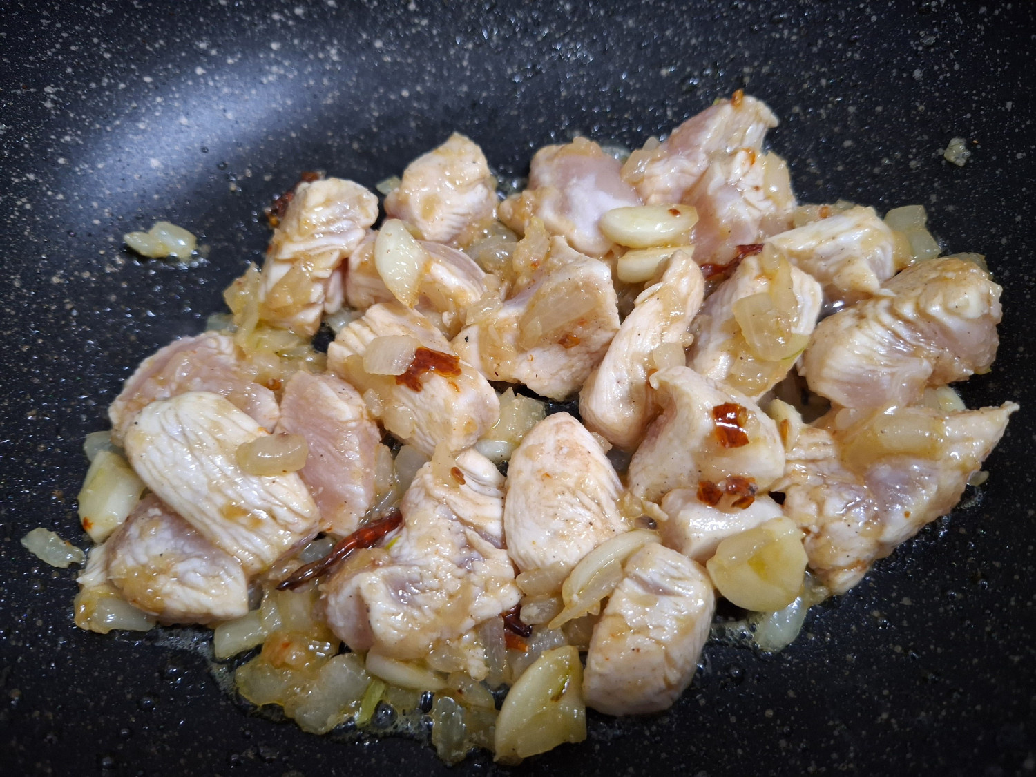 3분 후에 재워둔 닭가슴살을 넣고