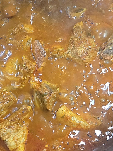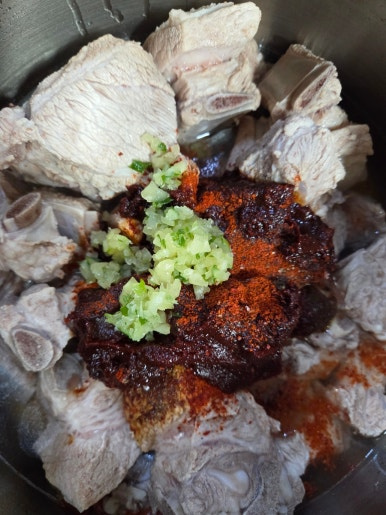 다시 냄비에 돼지갈비를 넣고 양념장을 넣고 물 1.5l를 넣어주세요.