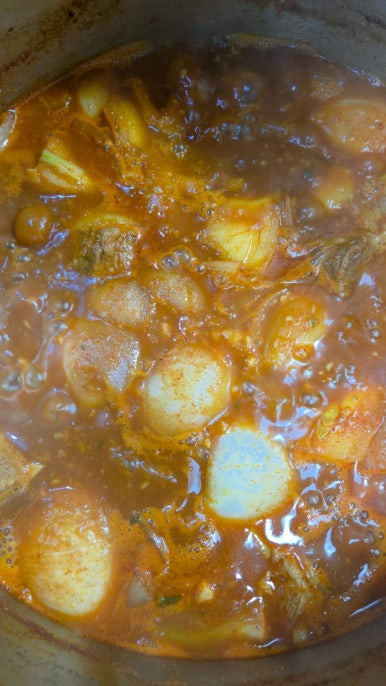 중간에 한두 번만 살짝 뒤집어주고, 국물이 자작하게 유지되도록 부족하면 물을 소량 추가합니다. 마지막에 대파와 청양고추를 넣고 한소끔 더 끓이면 완성입니다.