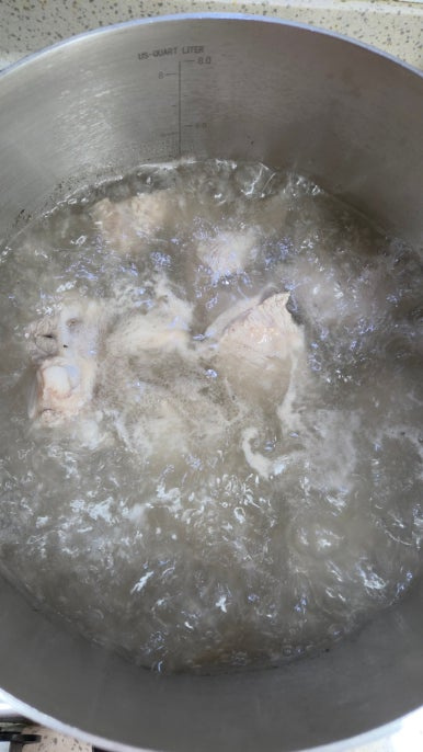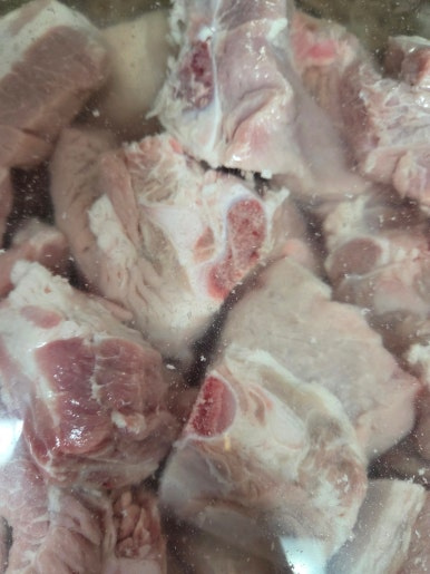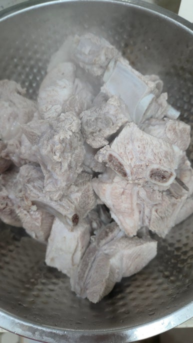 냄비에 물이 끓기 시작하면 돼지갈비를 넣어 주세요. 5분 정도 더 끓이고 찬물에 돼지갈비를 씻어 주세요.