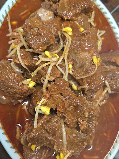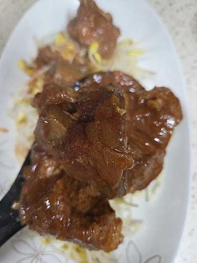 접시에 콩나물을 깔고 완성된 돼지갈비찜을 올려주세요. 그리고 국물을 부어주세요.