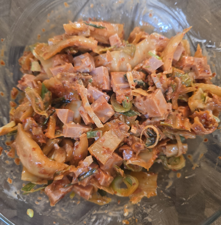 신 김치 한 공기 스팸 200g 밥 한 공기 통깨 약간 후추 톡톡 , 신김치 양념 : 마요네즈 1 설탕 0.5 다진 마늘 0.5 송송 썬 대파 1/2대 , 계량 : 밥숟가락
