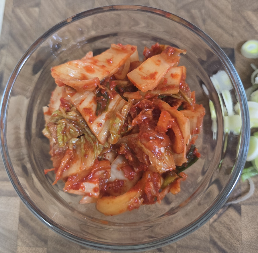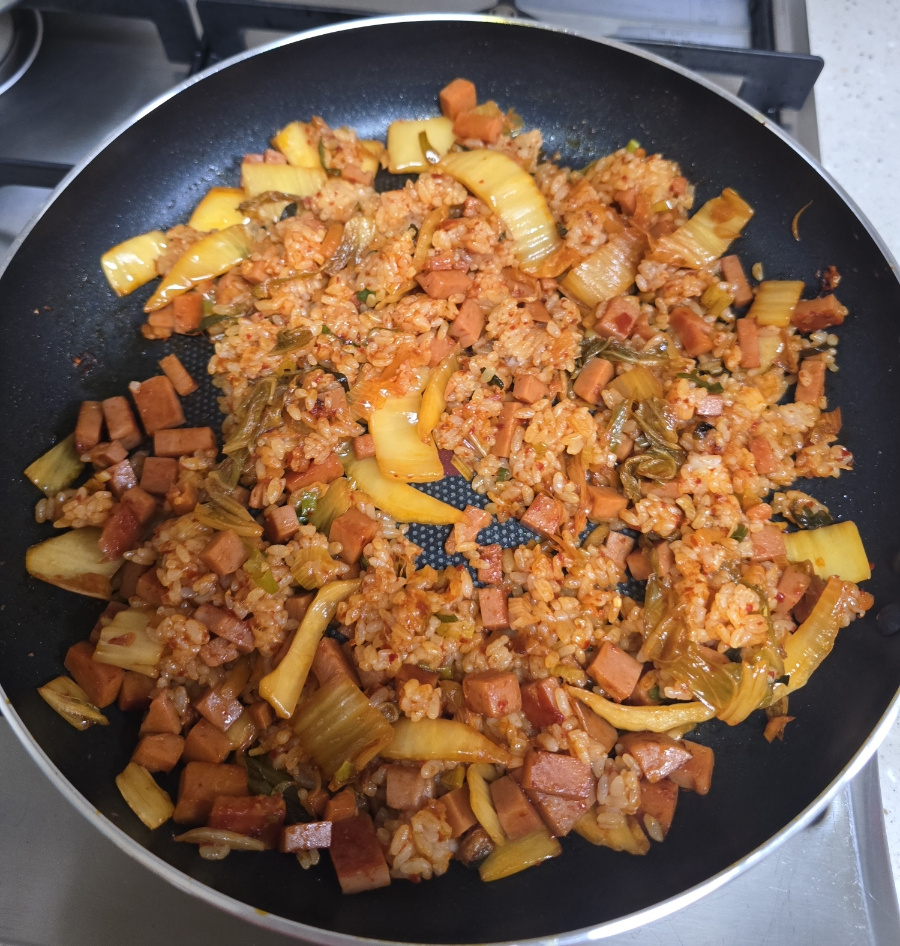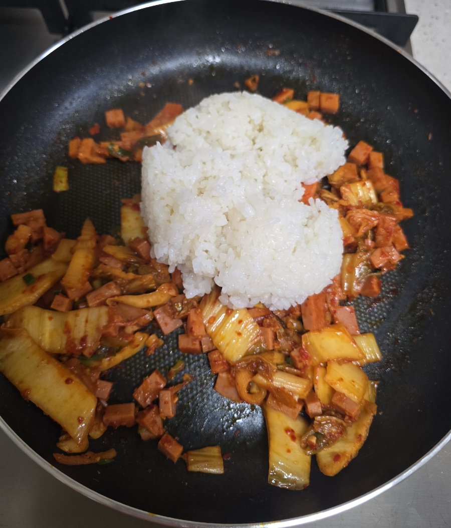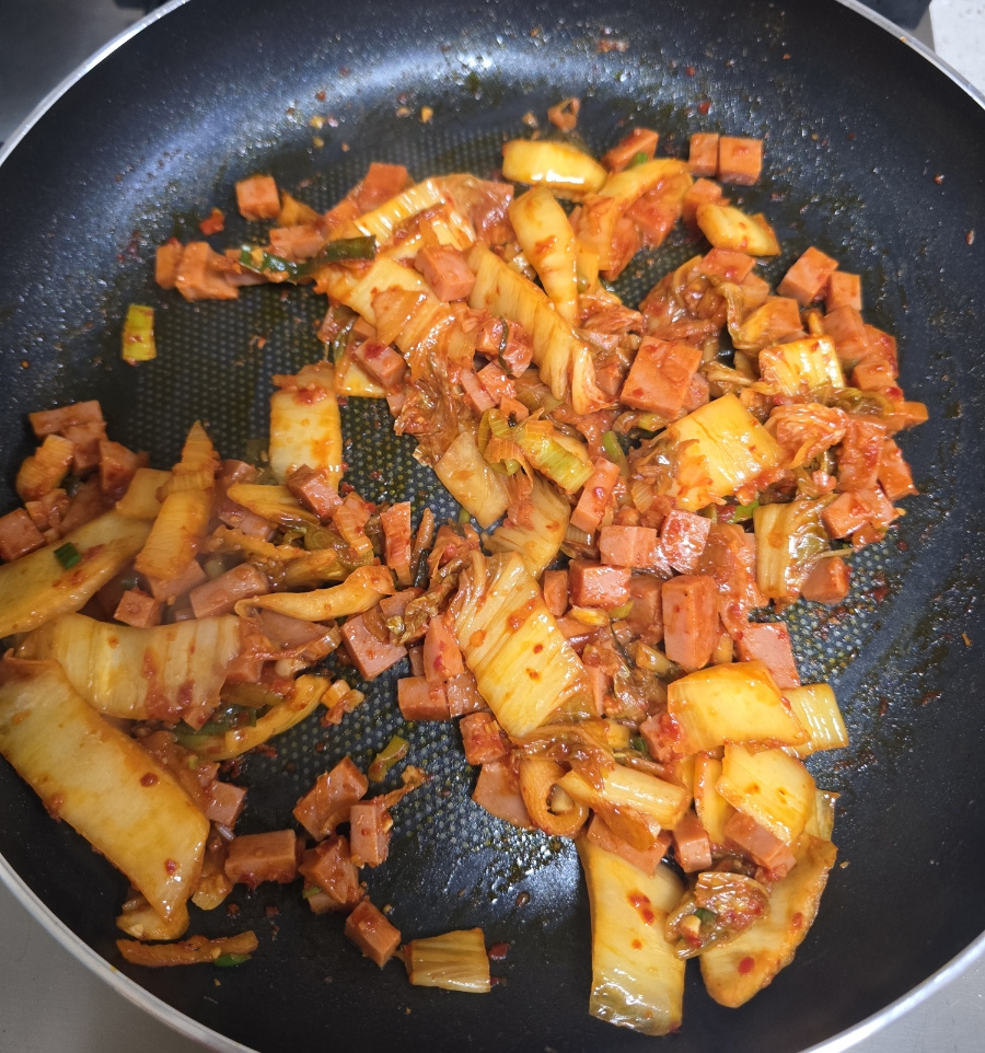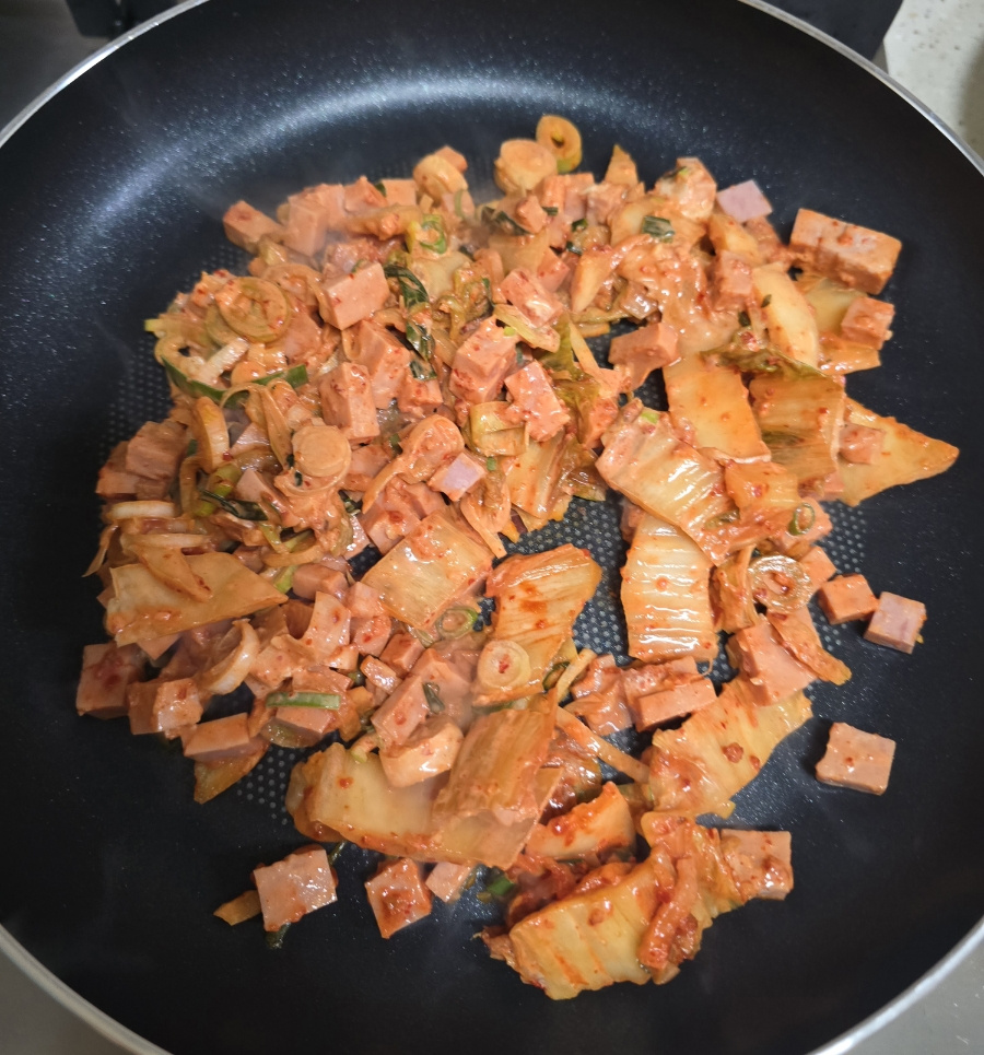 스팸을 구웠던 팬에 마요네즈에 버무린 김치를 넣고 중불에서 달달 볶아주세요.