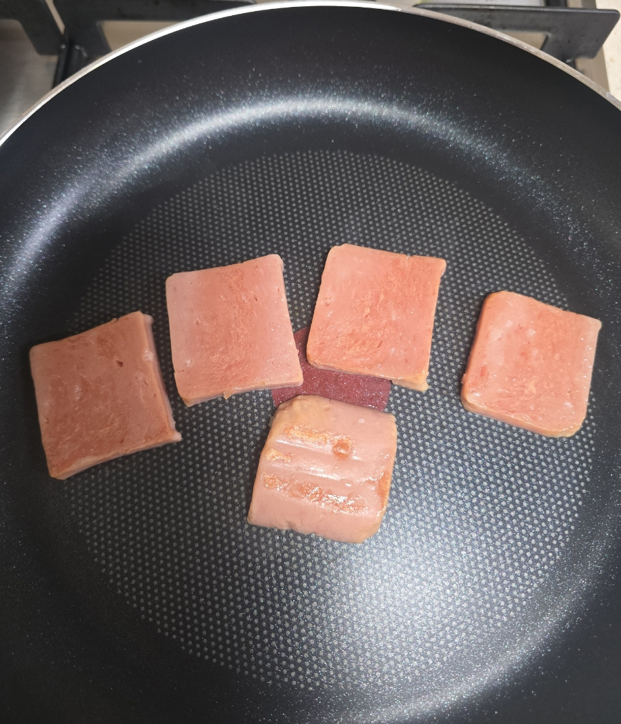 팬을 달구고 큼직하게 썬 스팸을 노릇하게 구워 주세요.