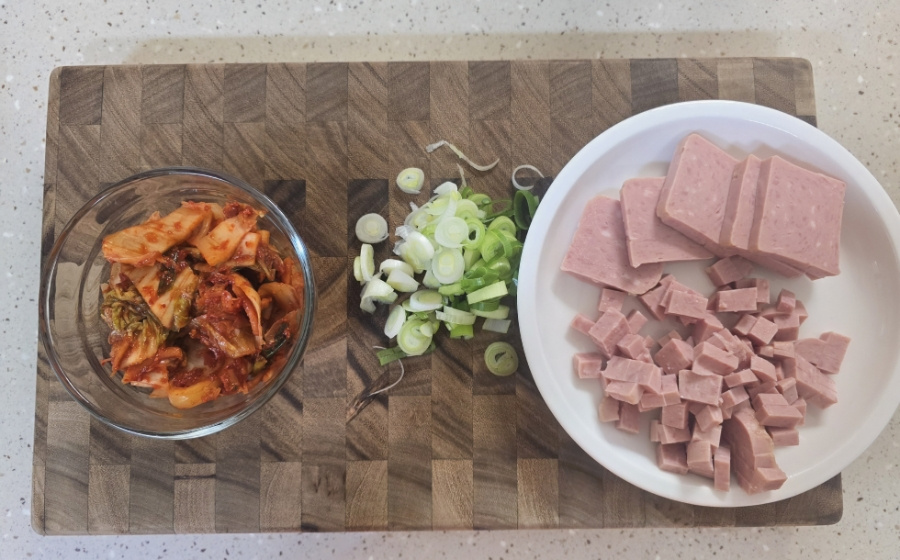 대파는 송송 썰고 스팸 반은 깍둑썰기 나머지는 큼직하게 잘라요.