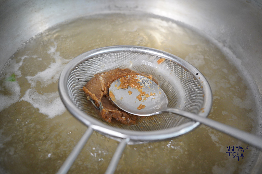 된장 2큰술을 체에 넣고 물에 잘 풀어주세요