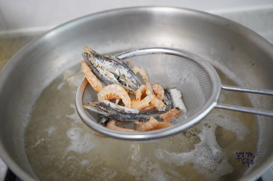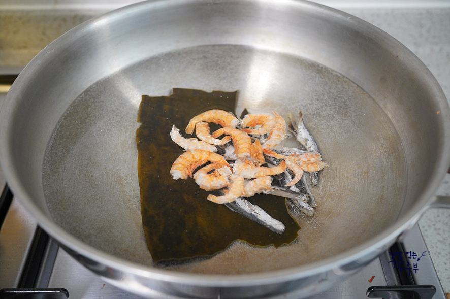 멸치, 새우, 다시마 넣고 육수를 끓여줍니다. 넣기전 마른 후라이팬에 살짝 볶아서 넣어주시면 비린내 제거에 아주 좋답니다