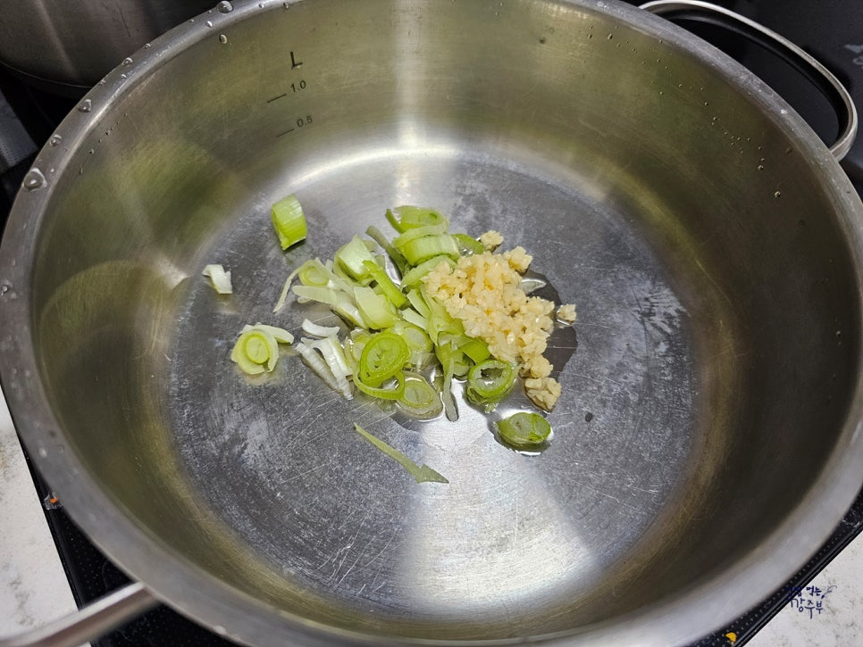 냄비에 식용유를 1숟가락 정도 두른 후 대파 2숟가락, 다진 마늘 1/2숟가락 넣어 볶아줍니다