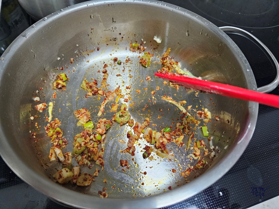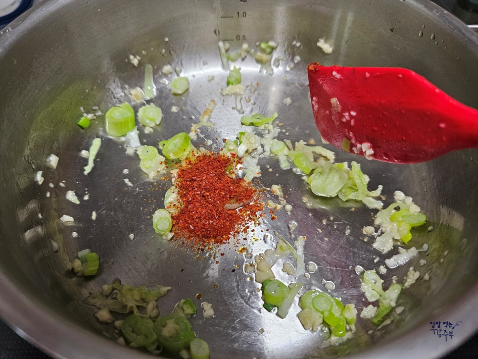 고춧가루가 타지 않도록 불을 살짝 줄이고 지그시 볶아주세요