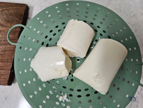 순두부는 시간이 지남에 따라 수분이 꽤 많이 나와요. 그래서 라면 끓이기 전 미리 구멍이 뚫린 체반이나 찜기 위에 올려서 물기를 빼두었어요