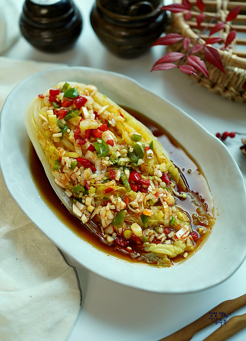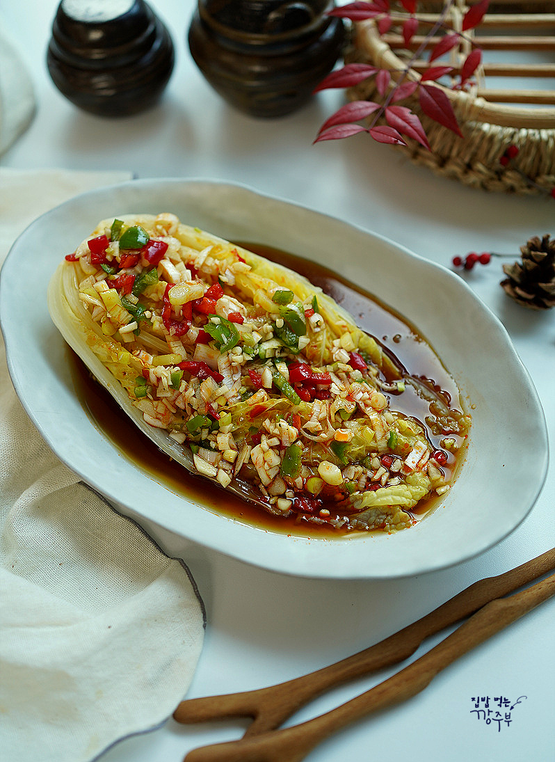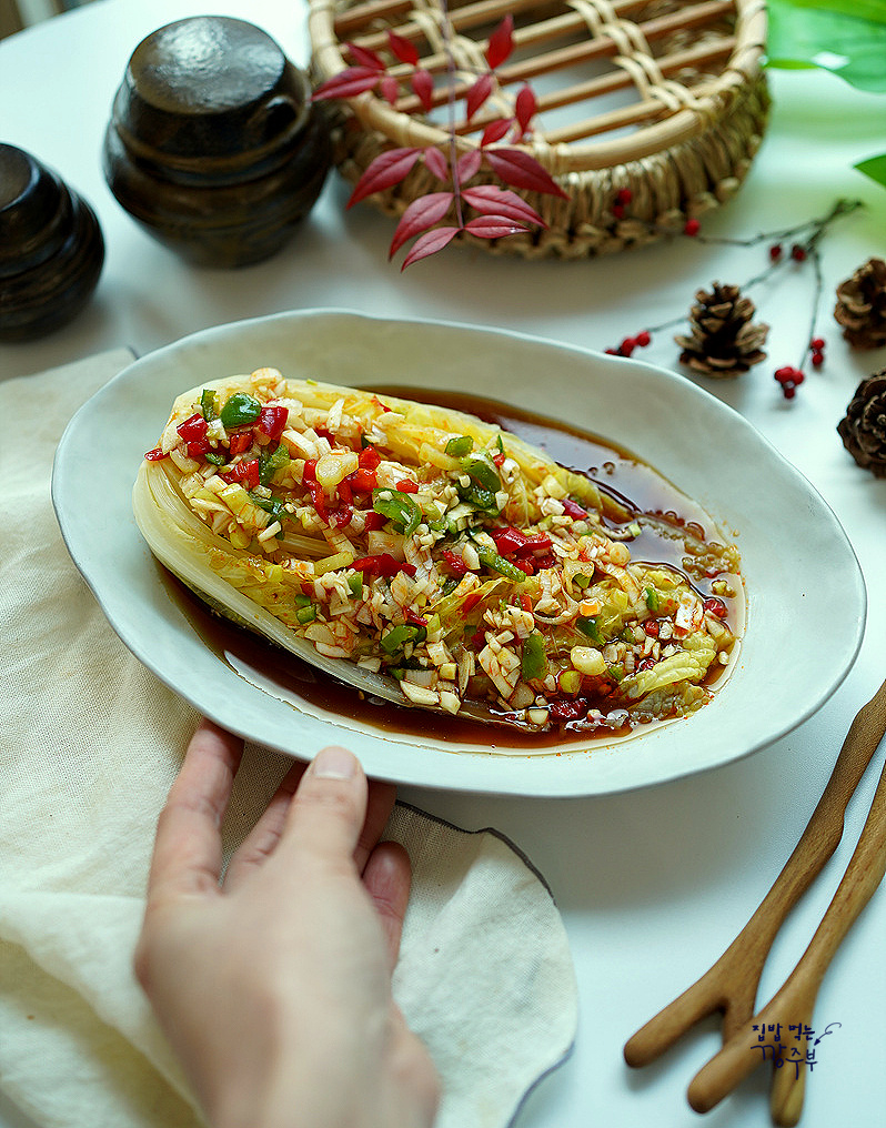 잘 익은 배추 한 잎 뚝 떼어 청양고추 쏭쏭 썰어 넣은 매콤한 양념 소스 듬뿍 올려 돌돌 말아먹거나 밥을 한 숟가락 싸서 싸서 먹어도 꿀맛이지요