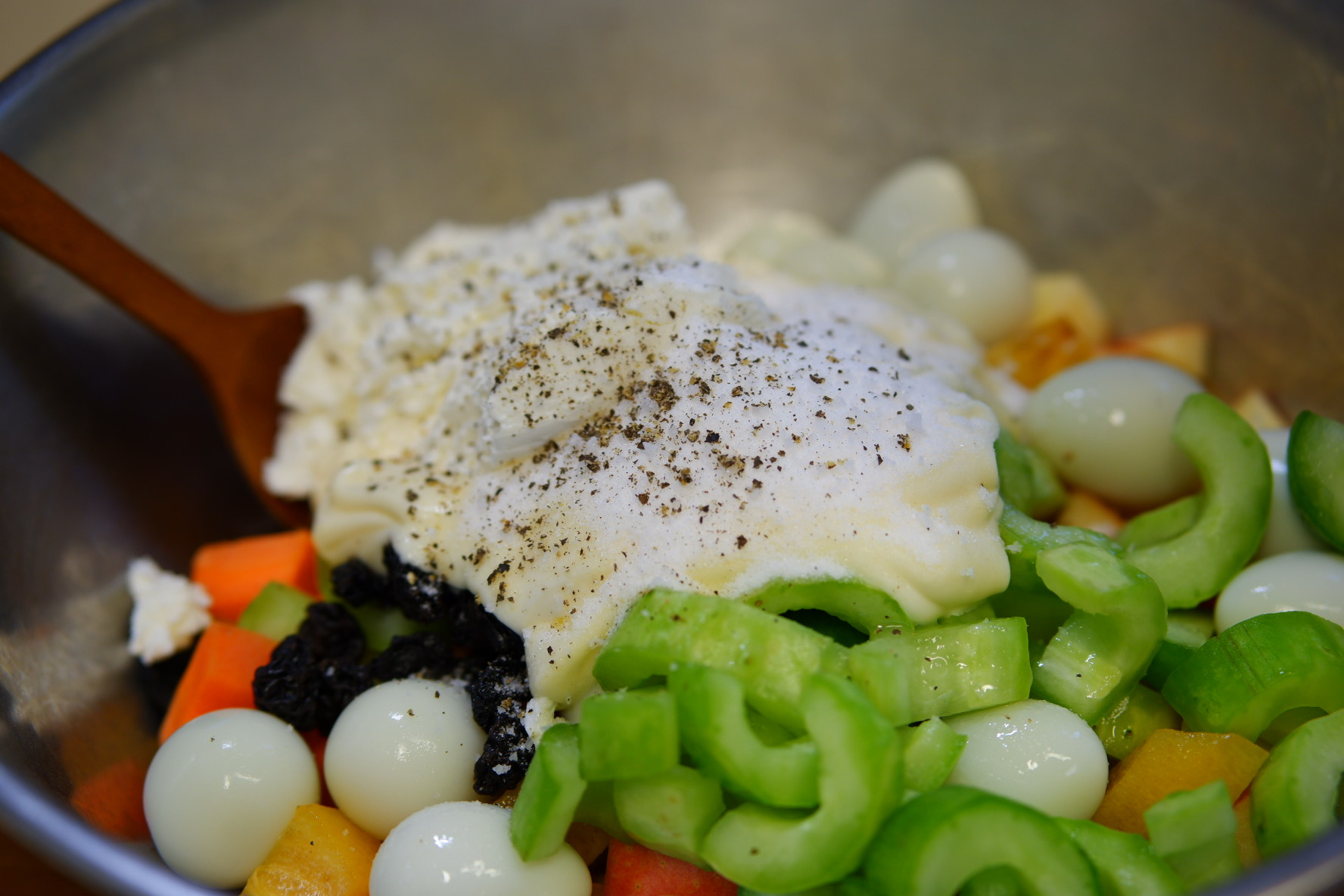 사과 1 개 , 오이 1 개 , 단감 1 개 , 당근 1/2 개 , 메추리알 270 g , 크래미 180 g , 건포도 한줌 , 마요네즈 200 g , 그릭요거트 100 g , 알룰로스 1T , 소금 , 후추
