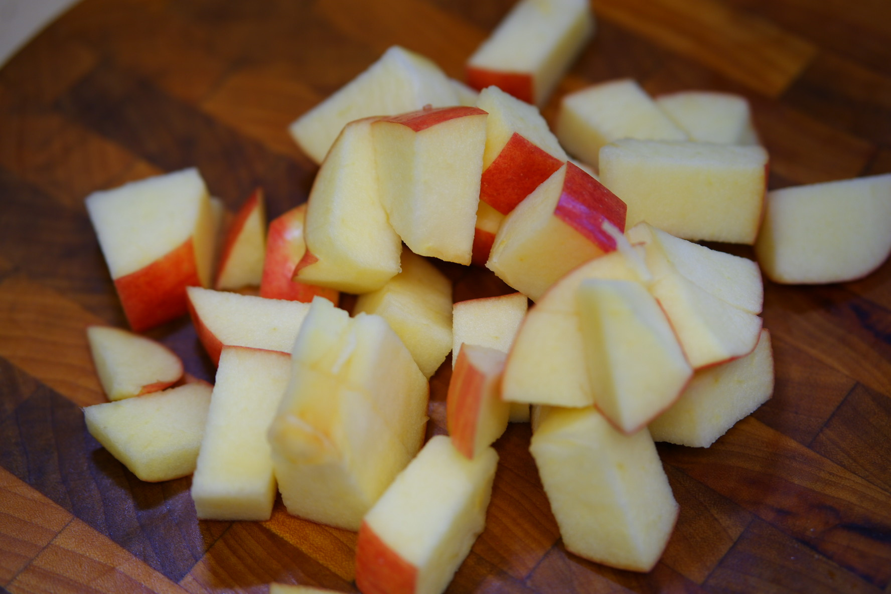 사과는 반 잘라 V자 모양으로 씨 제거하고 깍둑썰고 단감은 껍질 벗겨 깍둑 썰어 줍니다.
