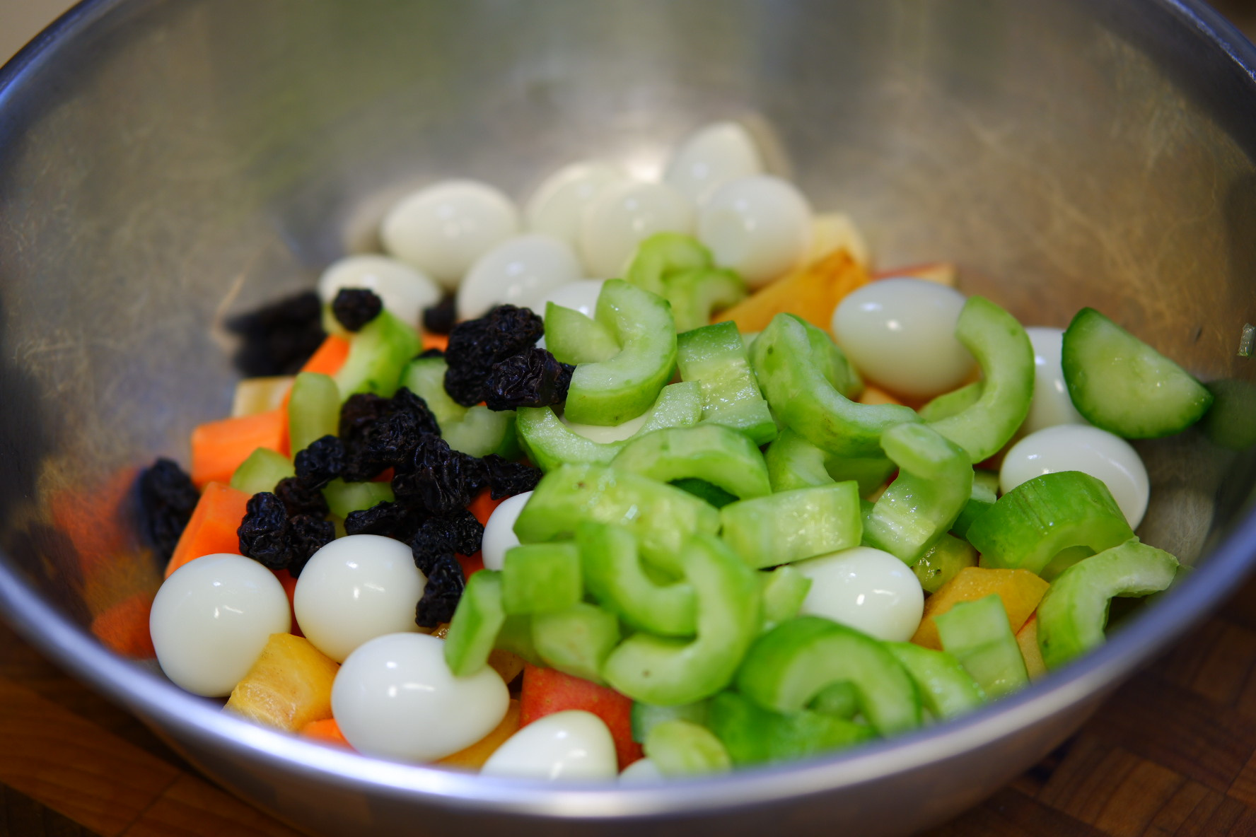 그릇에 사과, 단감, 당근, 오이, 메추리알, 건포도 넣어 주신 후