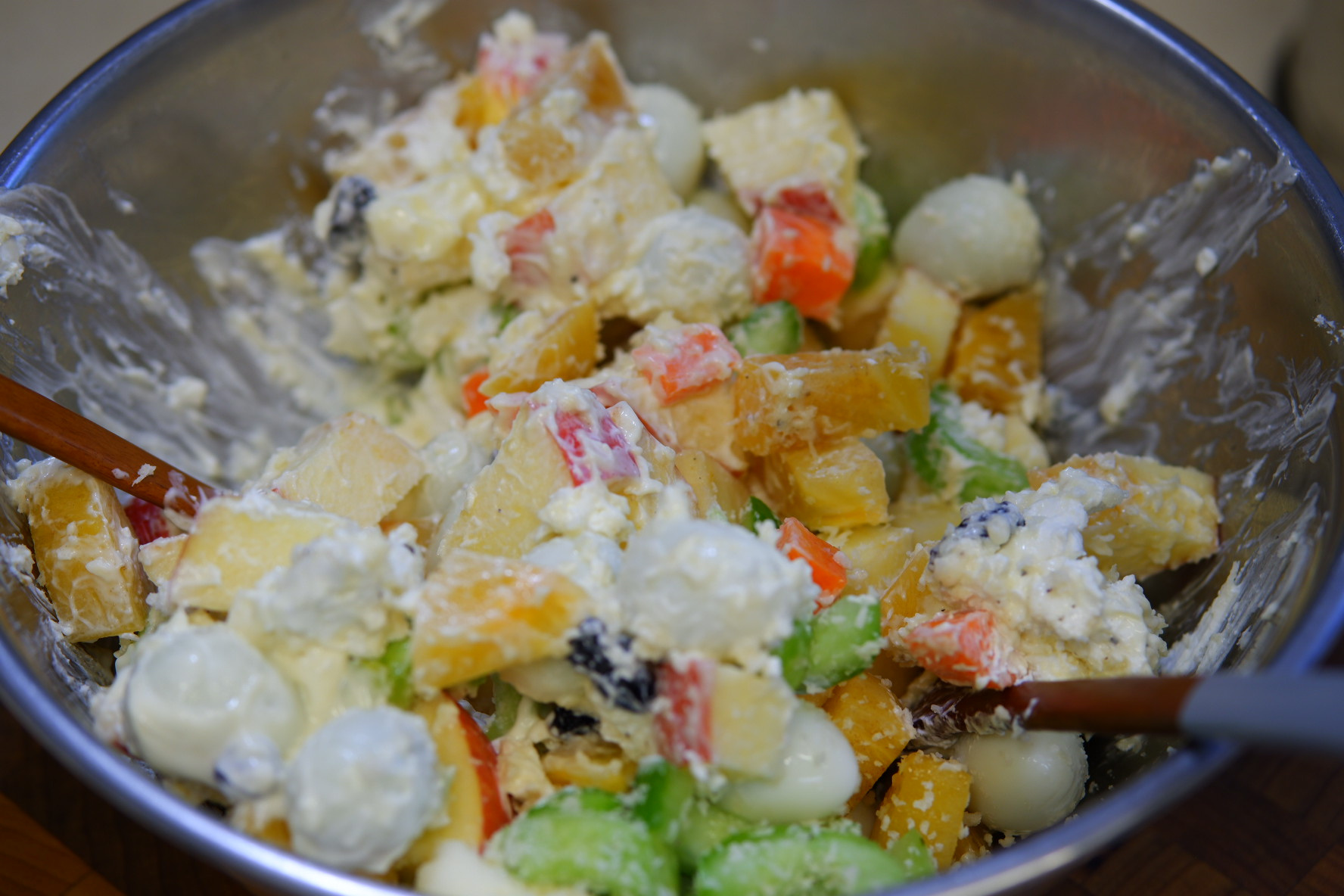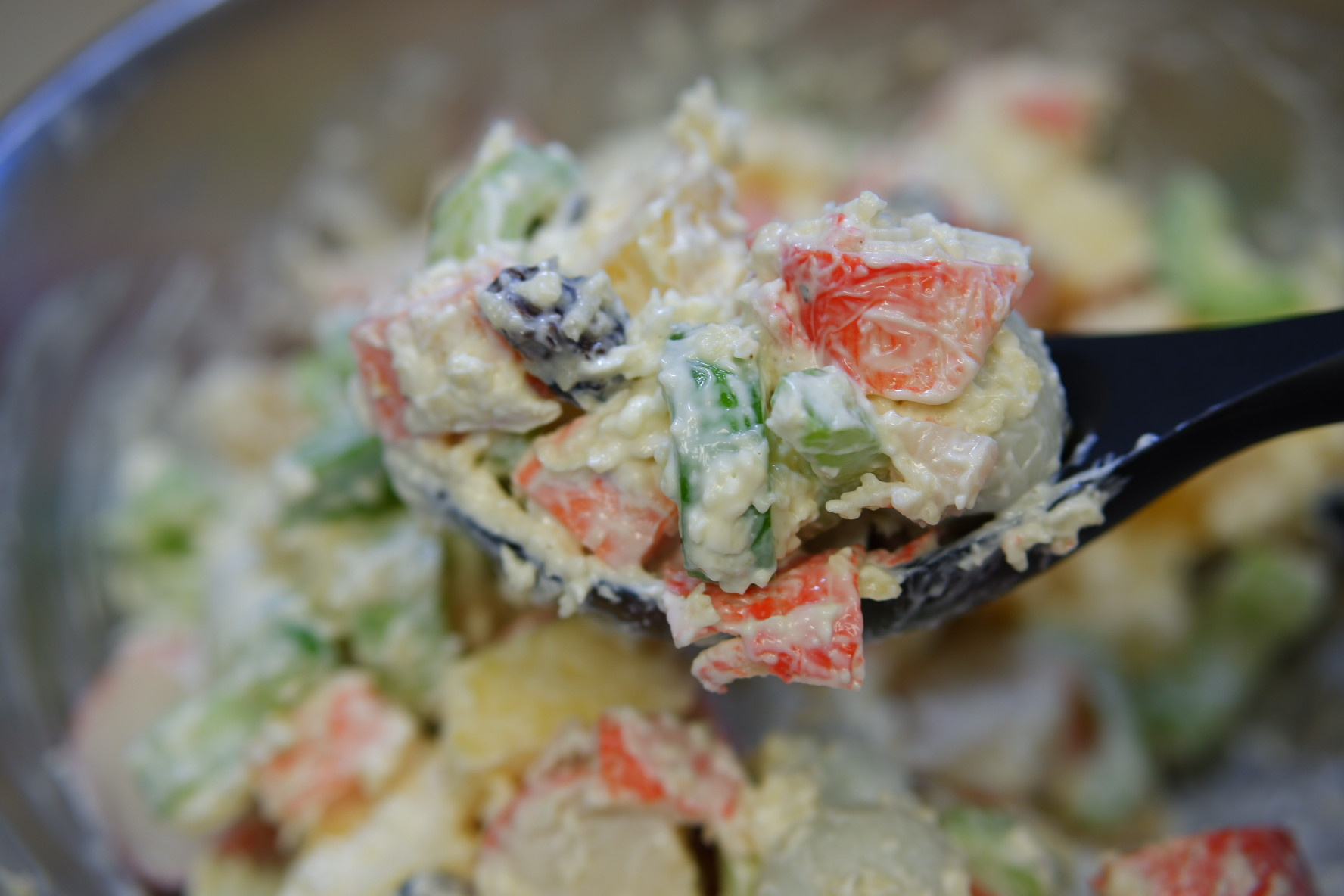 사과, 오이, 당근의 아삭한 식감과 메추리알과 크래미의 고소함, 건포도의 달콤함이 어우러져 다채로운 맛을 느낄 수 있는 옛날 과일 사라다입니다. 그릭 요거트를 섞어 마요네즈의 느끼함은 줄이고 깔끔하고 담백한 맛으로 기존 사라다의 최대 단점인 수분을 빵가루로 잡아서 다음날 먹어도 물기 없이 드실 수 있어요.