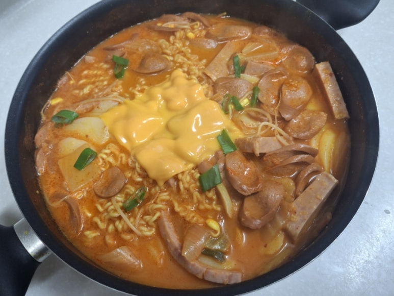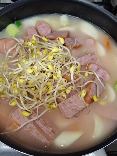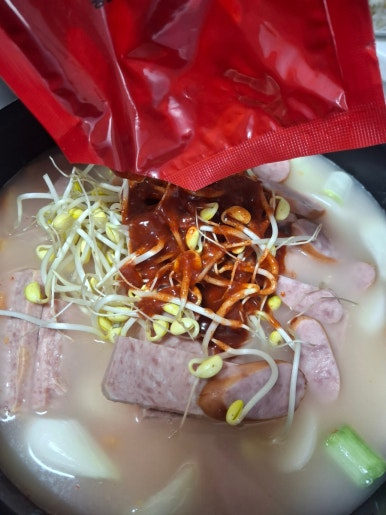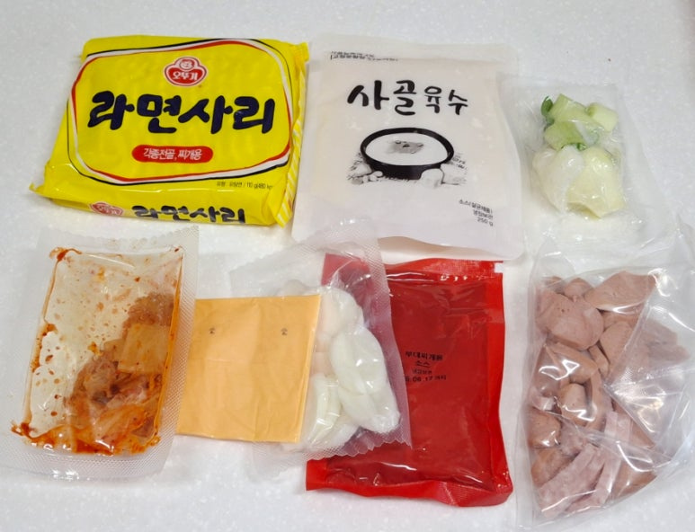 - 부대찌개밀키트 , 햄 , 라면사리 , 대파 , 양파 , 김치 , 치즈 , 떡국떡 , 햄 , 콩나물