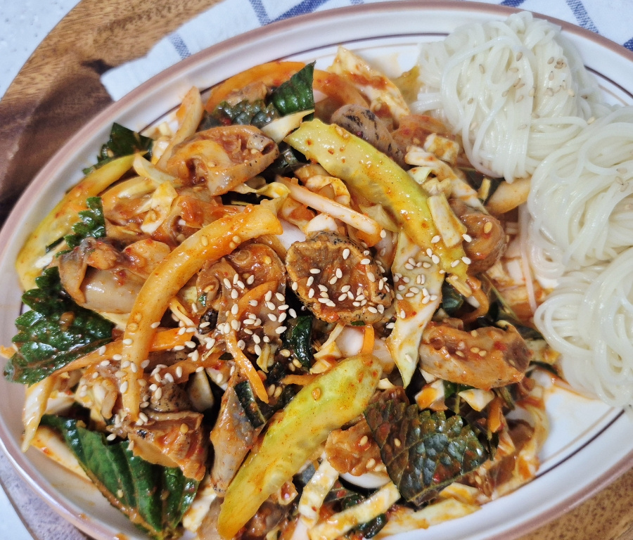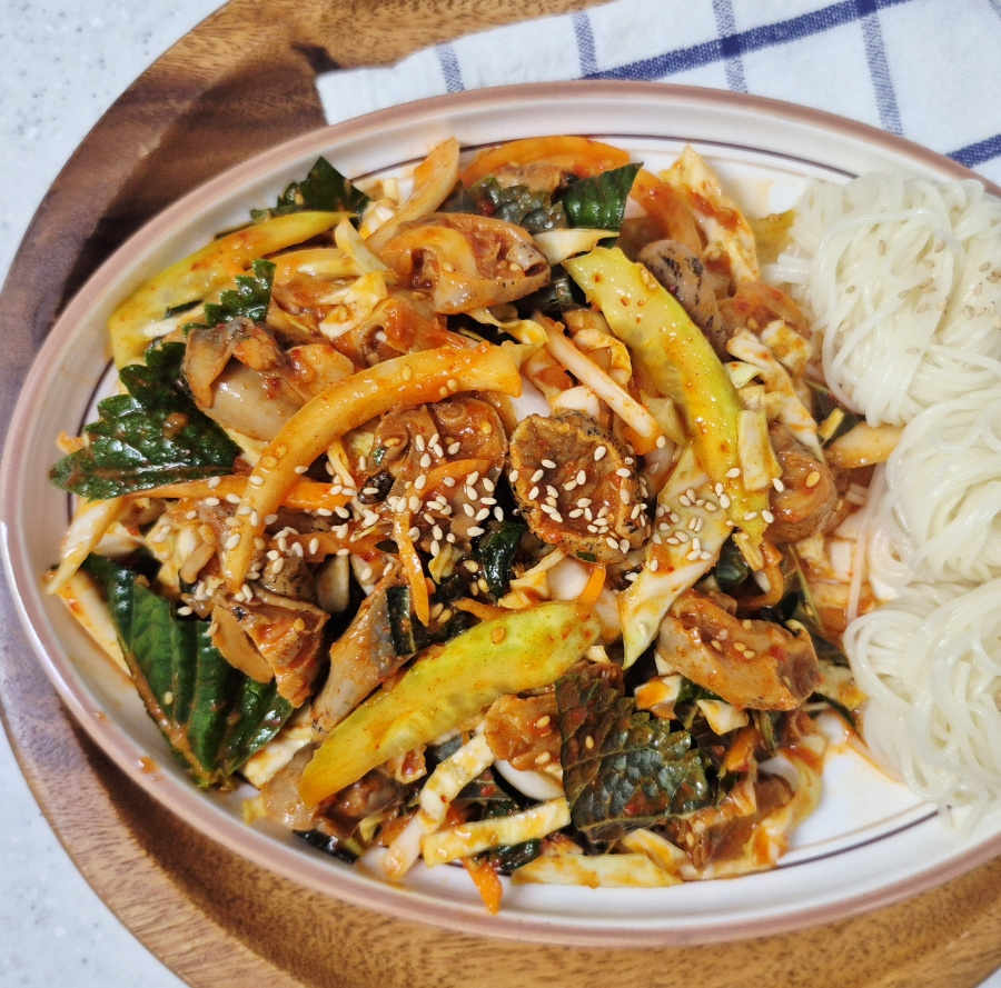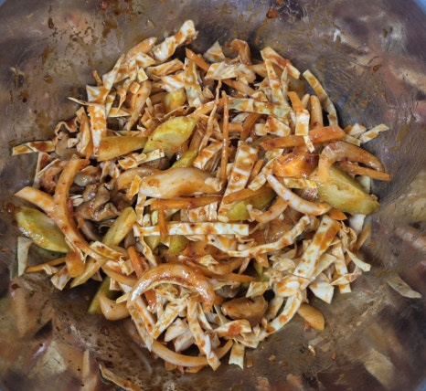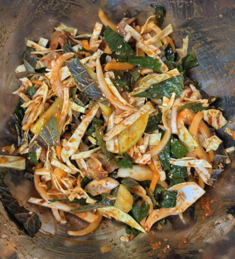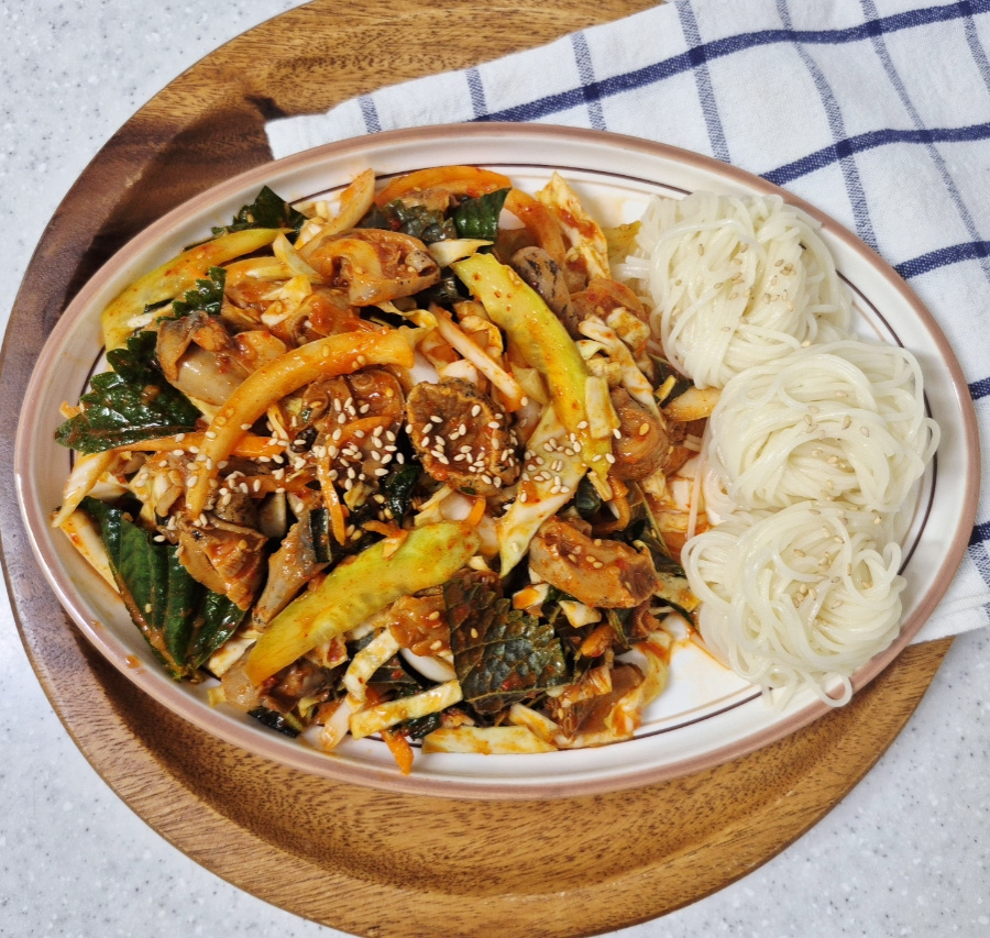 양배추는 물에 담가 세척 후 물기를 최대한 빼 주어야 양념에 무쳤을 때 물기가 덜 생깁니다.