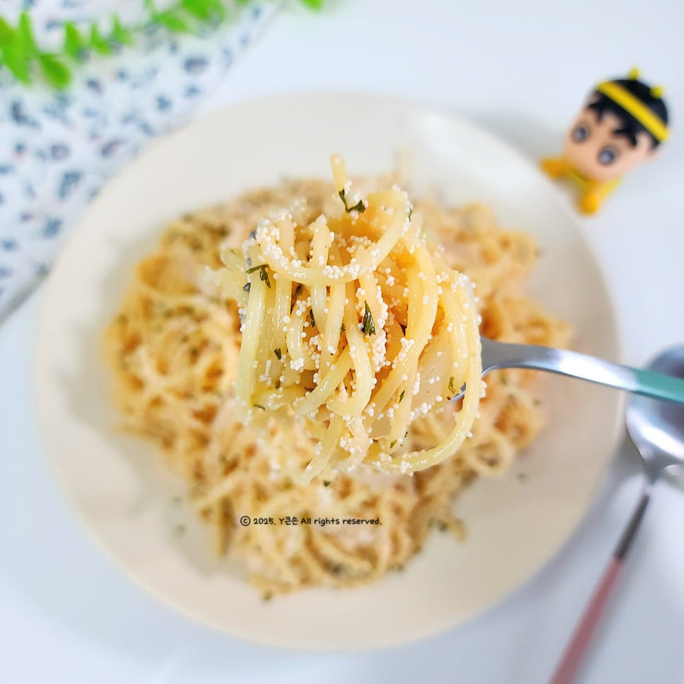 취향에 따라 면수를 조금씩 넣어가며 농도를 조절해 주세요. 명란의 짠맛으로 충분했지만 부족하다면 소금으로 간을 해주세요.