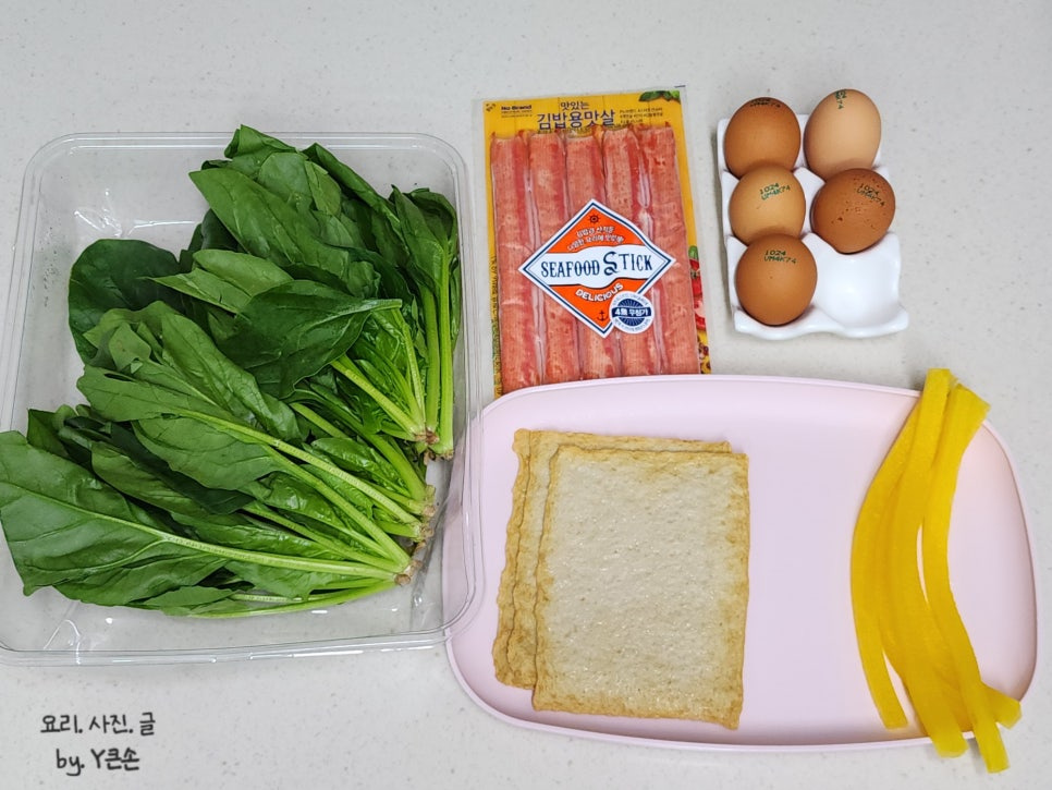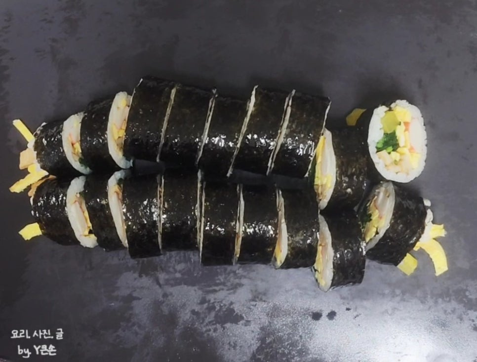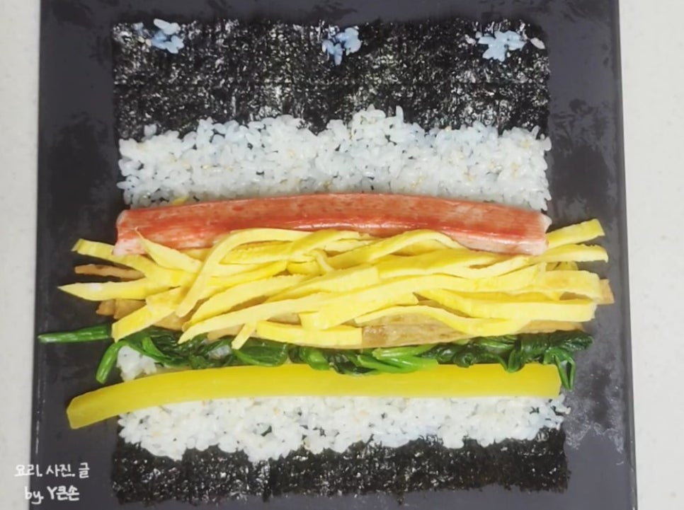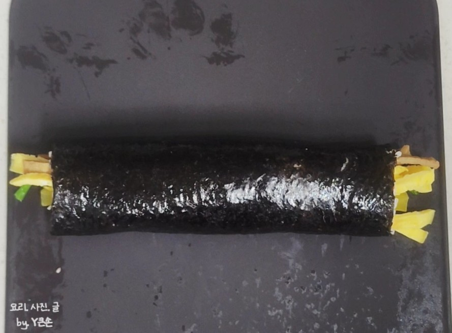 양 끝에는 단단한 재료를 두어야 김밥이 터지지 않고 단단히 말려요.