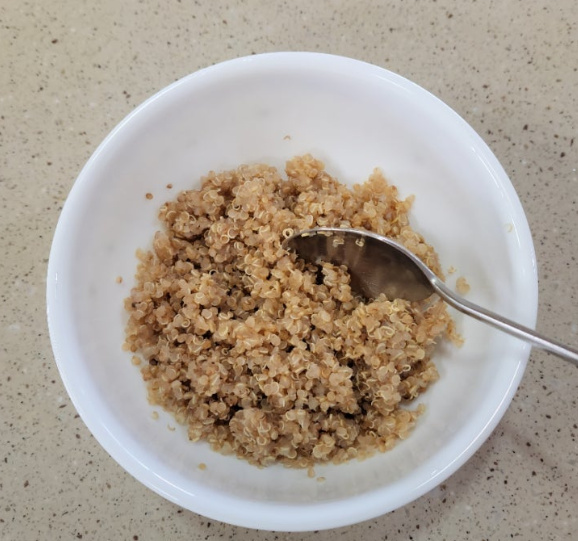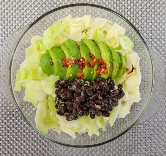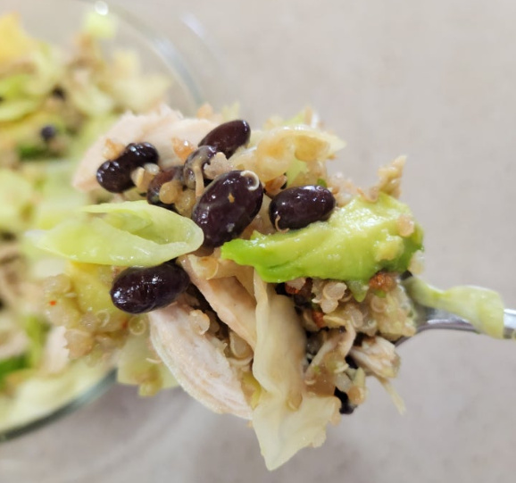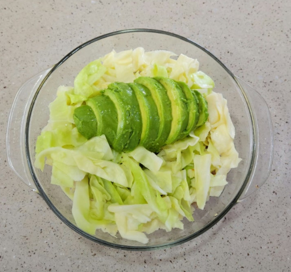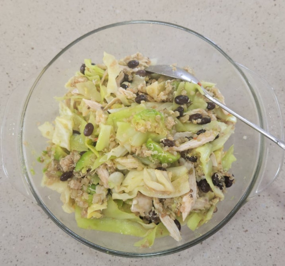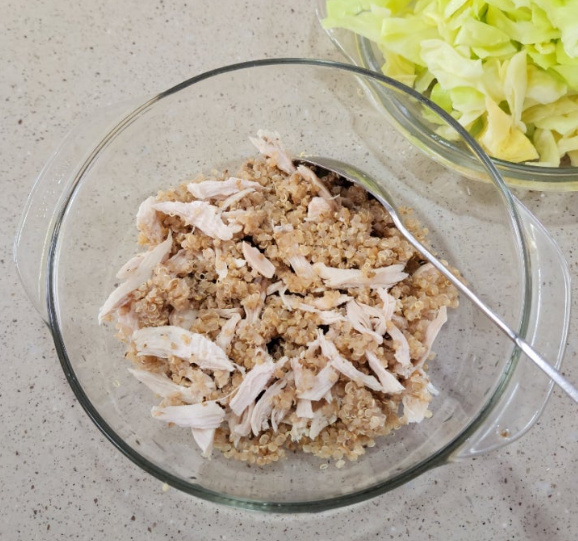 퀴노아 밥과, 닭가슴살은 이미 익혀서 냉장 보관했던 상태~ 양배추의 수분으로 살짝 뜸들이 듯 같이 넣고 익히면 편해요.