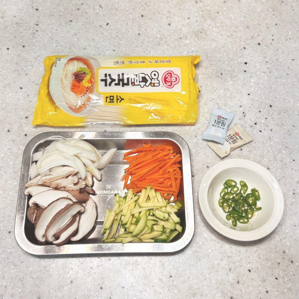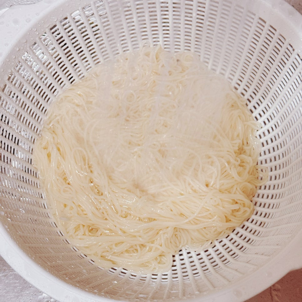 - 면은 끓는 물에 3분 정도 삶아준 다음, 찬물에 행궈준 다음 물기를 빼주세요.