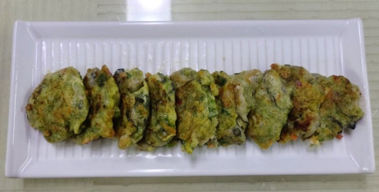 푸른빛이 살짝 도는 굴전 정말 맛있어요 매생이를 많이 넣으면 굴전의 맛을 해칠 수 있는데 아주 조금 넣었더니 바다 향기 나면서 굴전이 더 맛있어졌어요 살짝 데친 후 만들어서 오동통통 육즙도 살아있고 질척이지 않아요 조리방법만 달리해도 훨씬 맛있는 굴전이 됩니다
