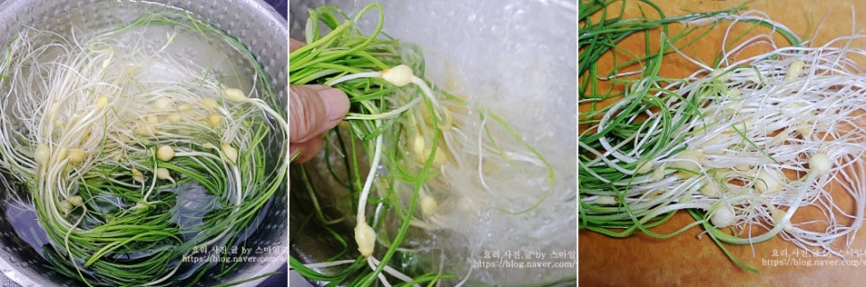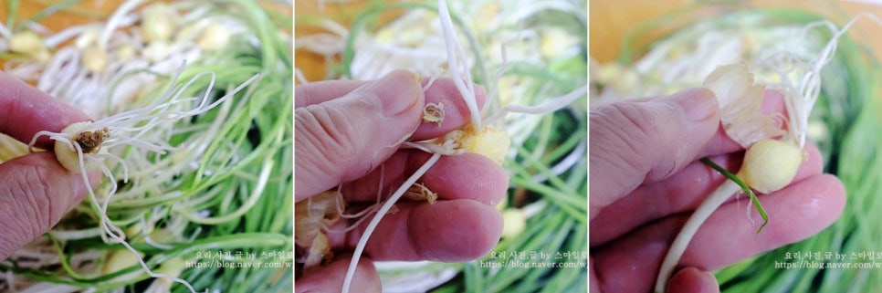물기를 탈탈 털어낸 후 알뿌리를 칼등으로 꾹 눌러 알뿌리를 으깨줍니다