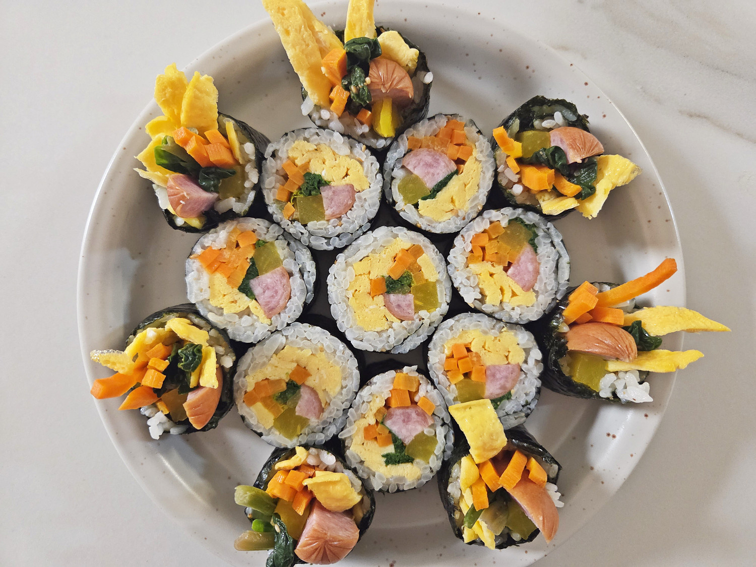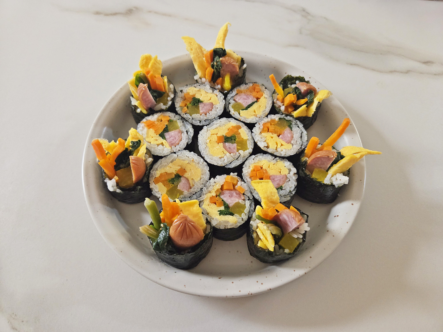 밥을 비워둔 공간에 물을 살짝 발라서 말아주면 쉽게 풀리지 않아요.