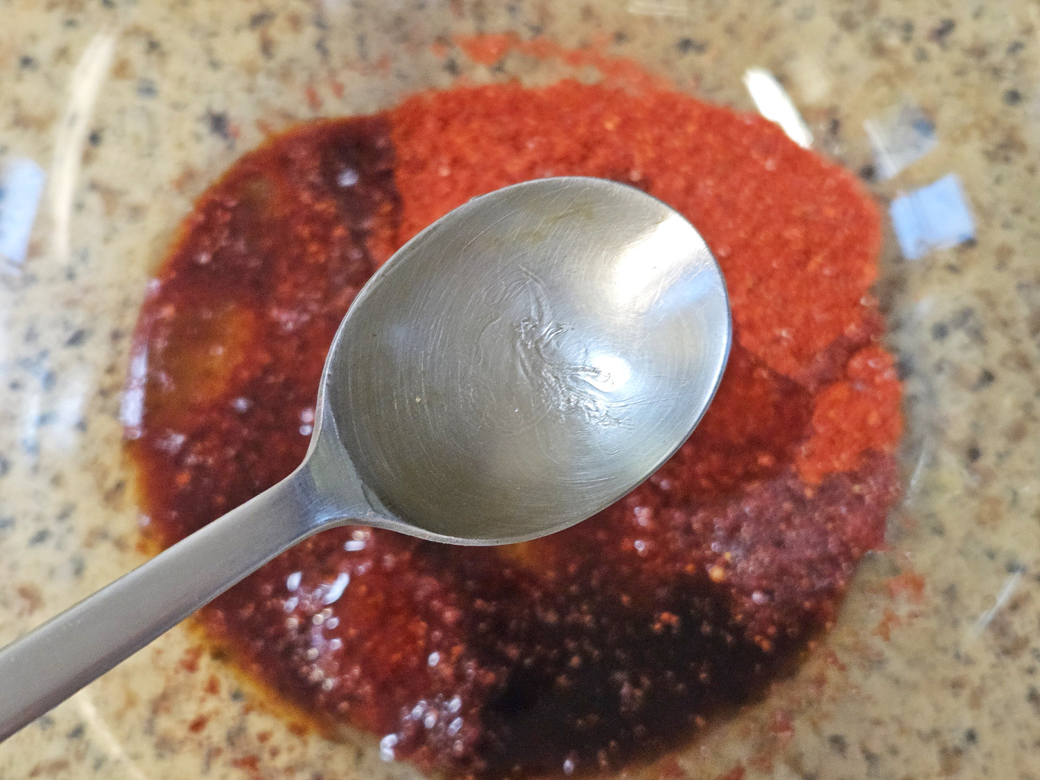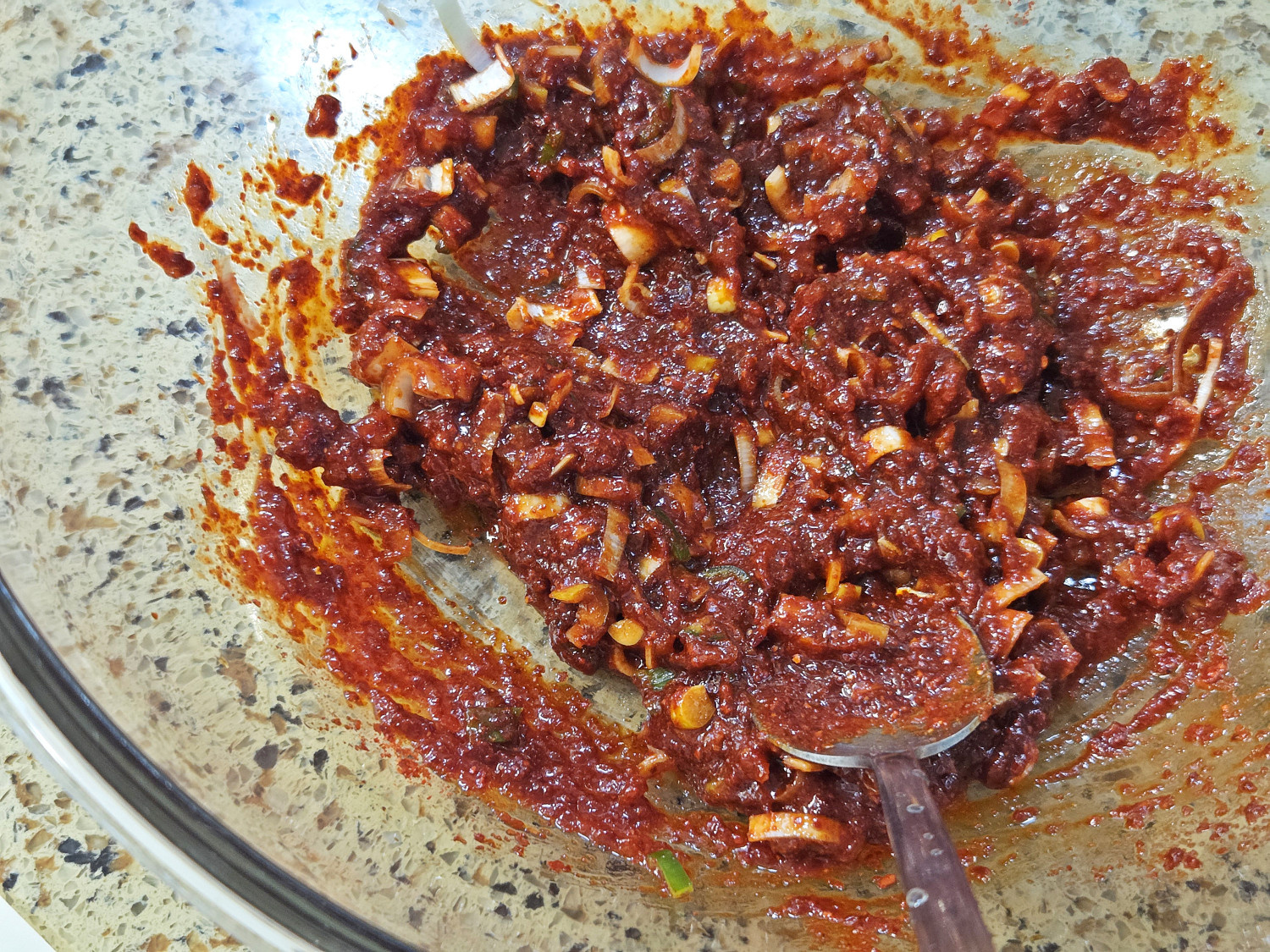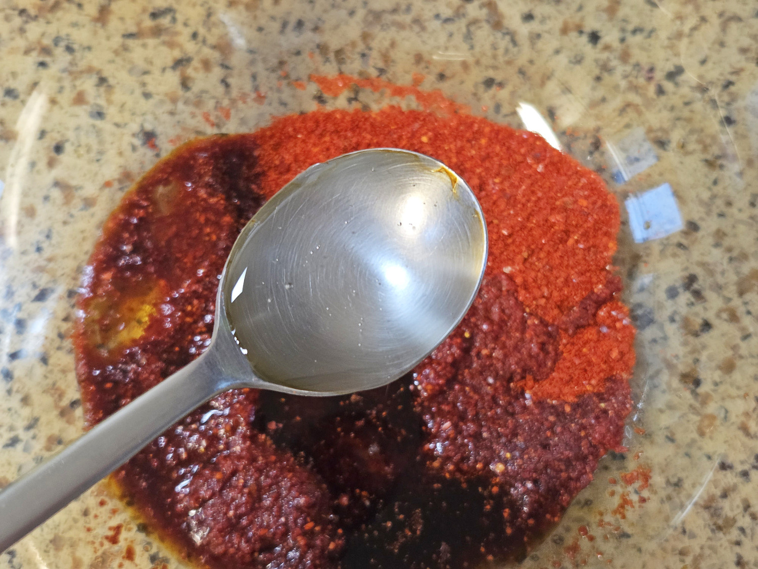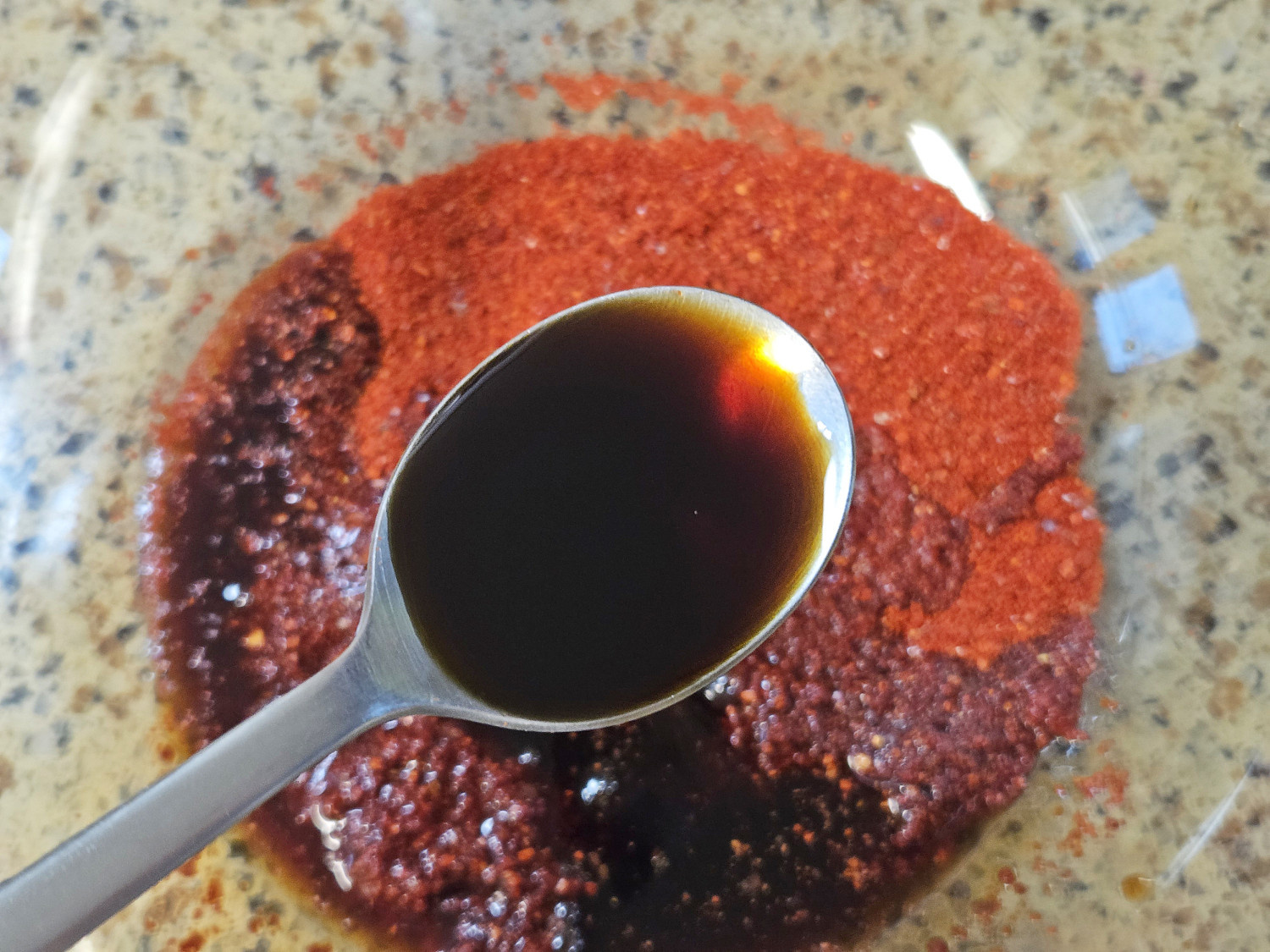 넓은 볼에 고춧가루 8큰술(½컵 정도), 연두 4큰술, 진간장 4큰술, 맛술 2큰술, 물엿 2큰술,