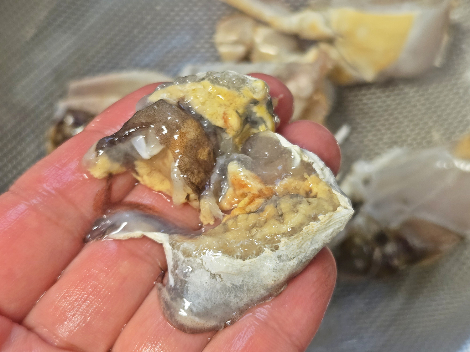 모래주머니도 떼어내고, 게딱지 속에 숨어 있는 내장도 손으로 훑어 빼줍니다.