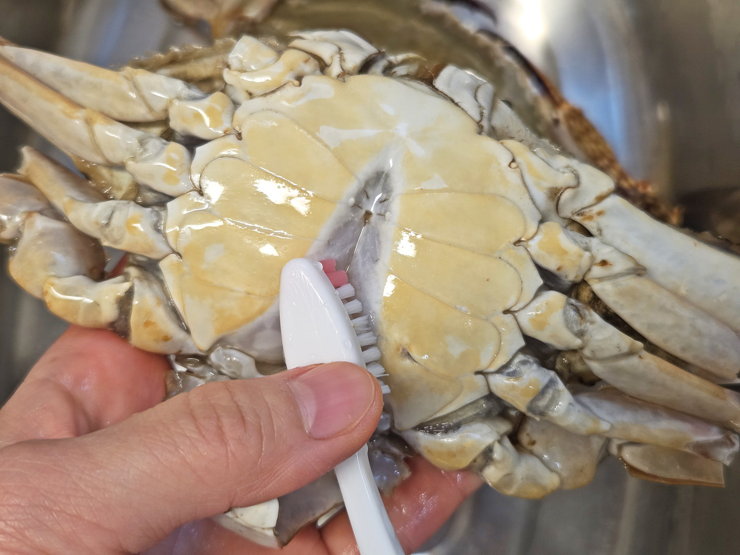 자 이제 솔을 이용해 게딱지를 제외한 몸통과 다리를 구석구석 닦아주세요.
