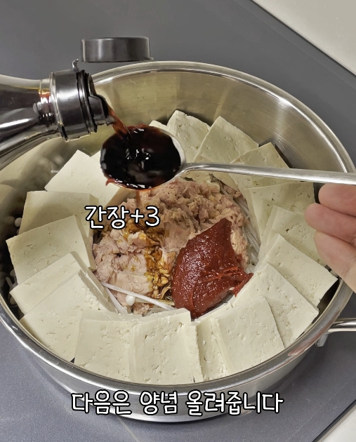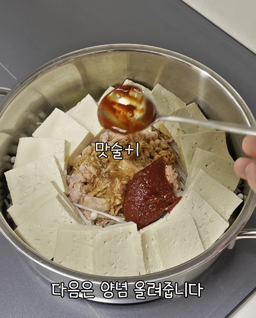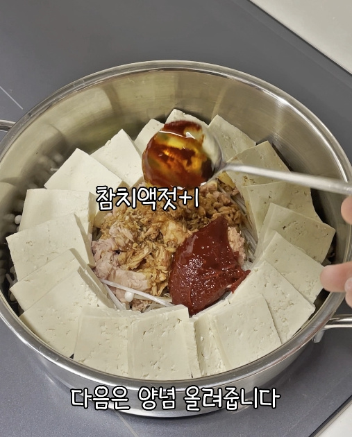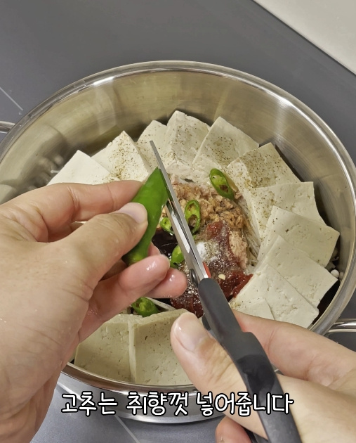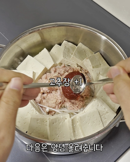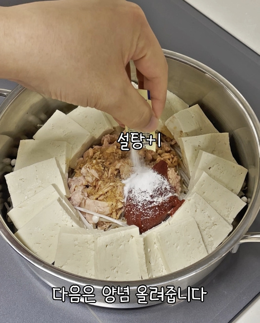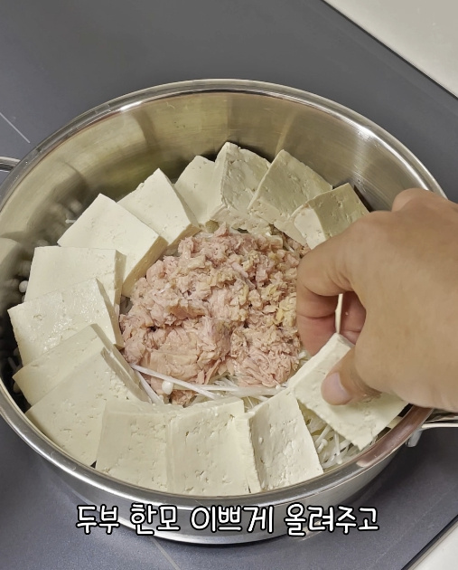 이제 썰어둔 두부 1모를 참치 주변으로 빙 둘러 올려줍니다.