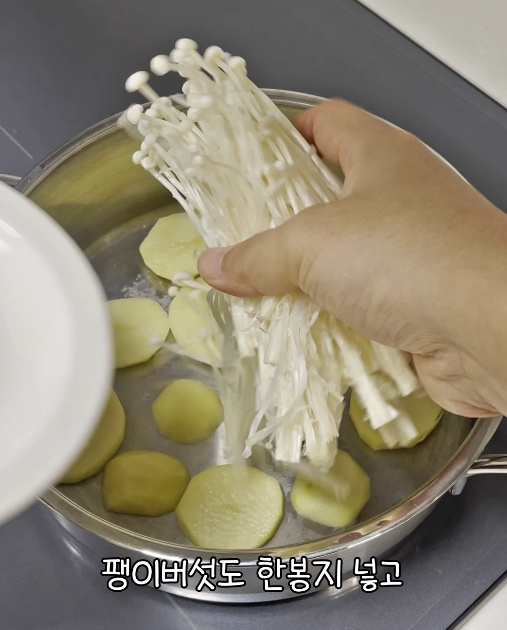 그 위에 팽이버섯 1봉지를 올려주고, 참치는 가운데에 기름까지 싹싹 털어 넣어주세요.