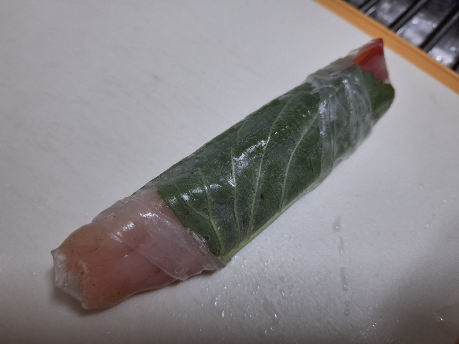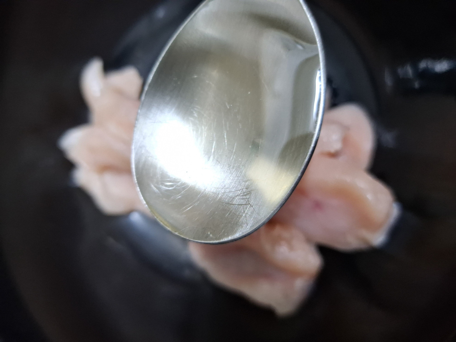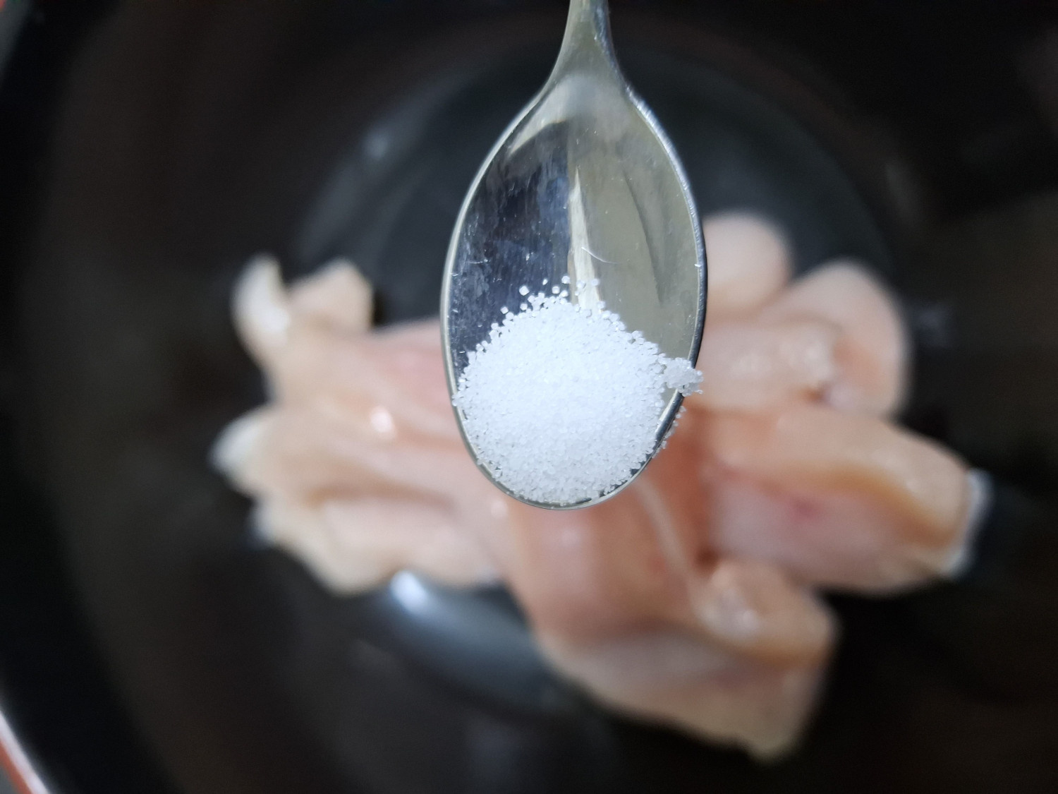 닭가슴살 한덩이 , 맛소금 1/2 티스푼 , 후추 두꼬집 , 미림 1 숟갈