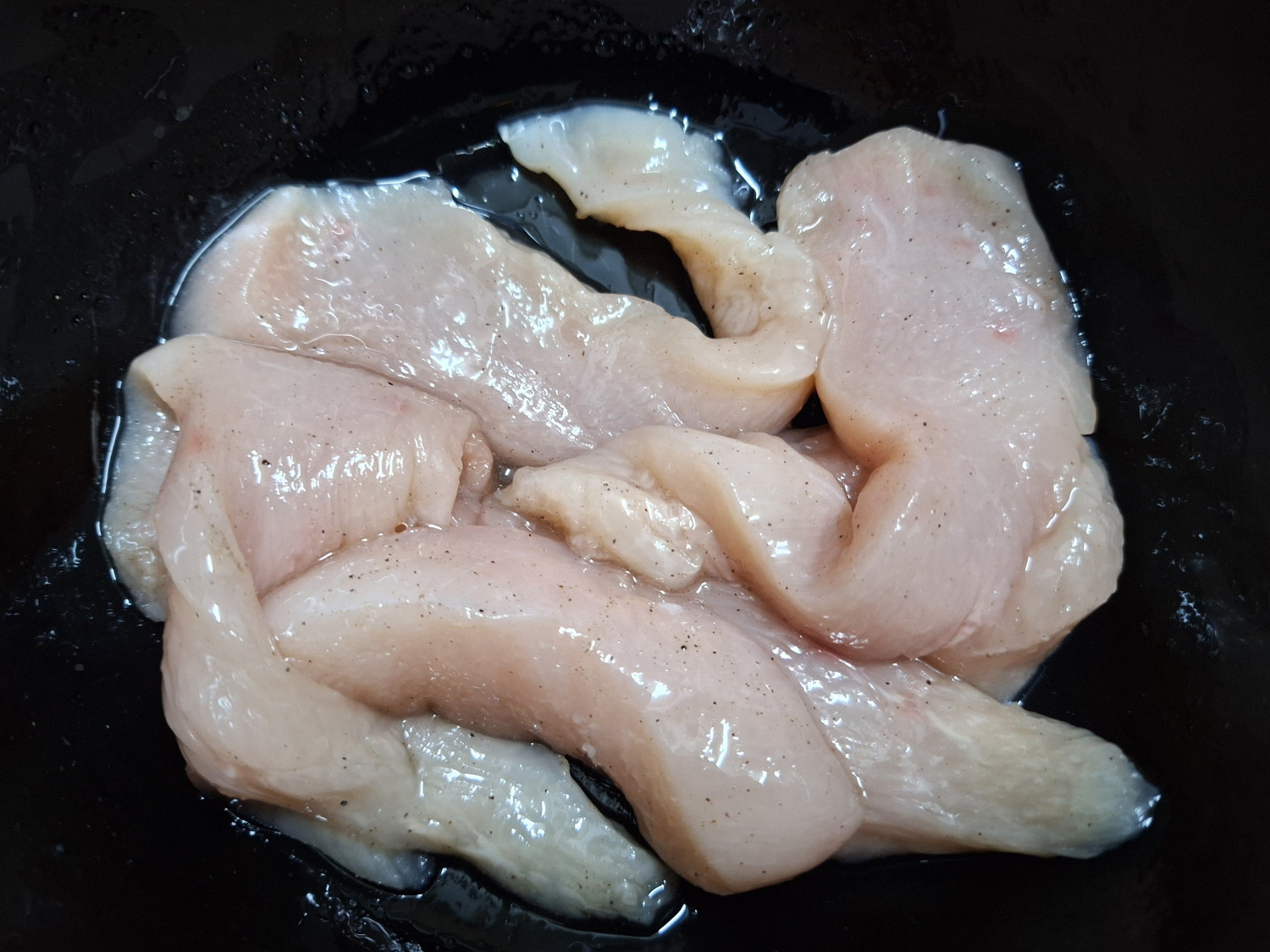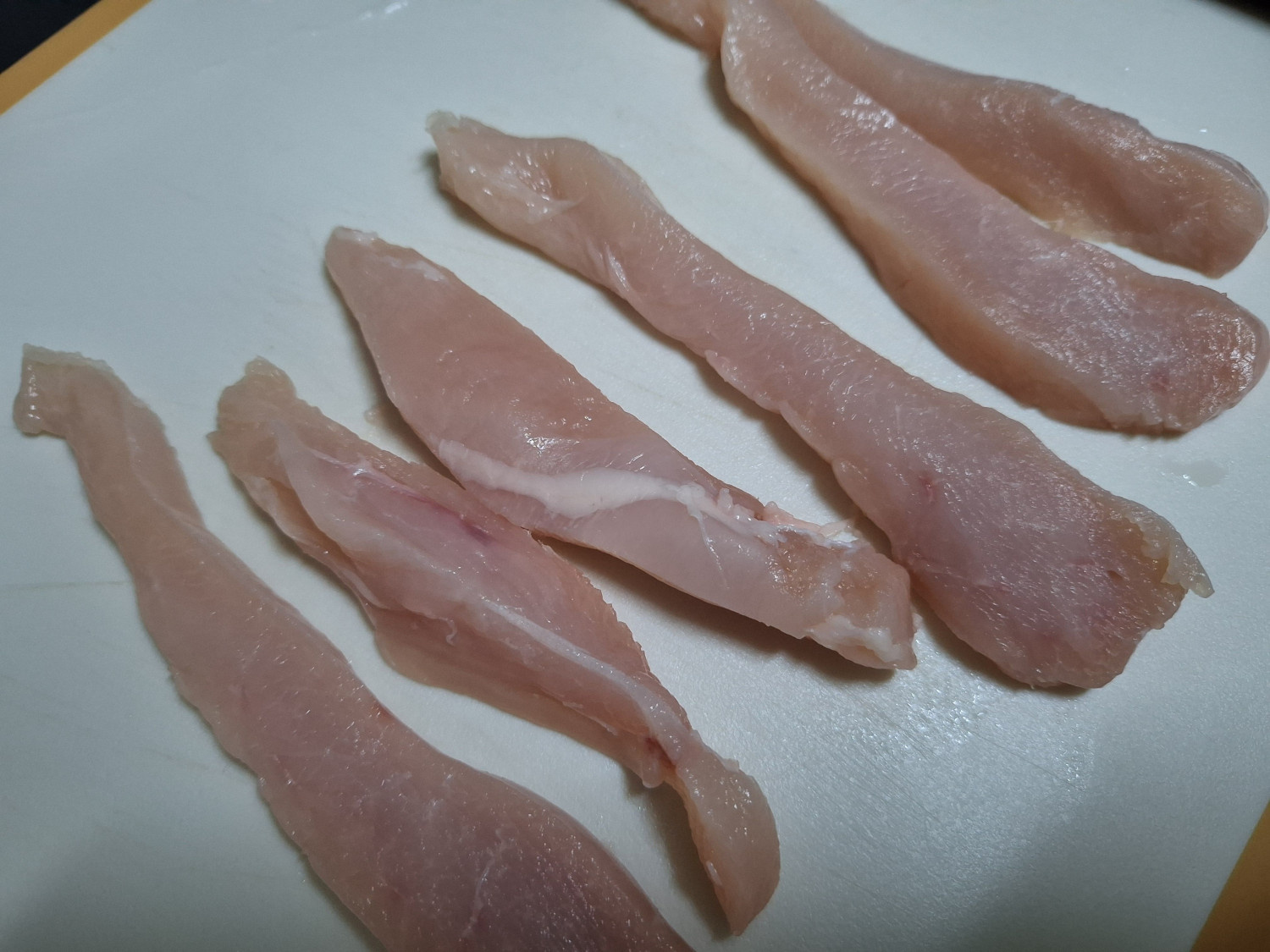 닭가슴살은 얇고 길게 6조각정도 나올 수 있게 썰어주세요.