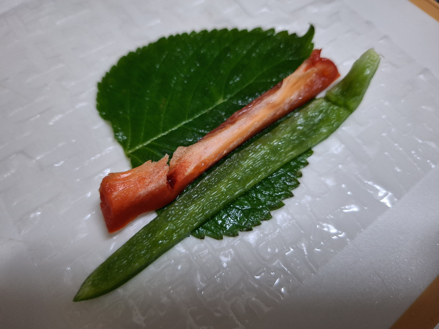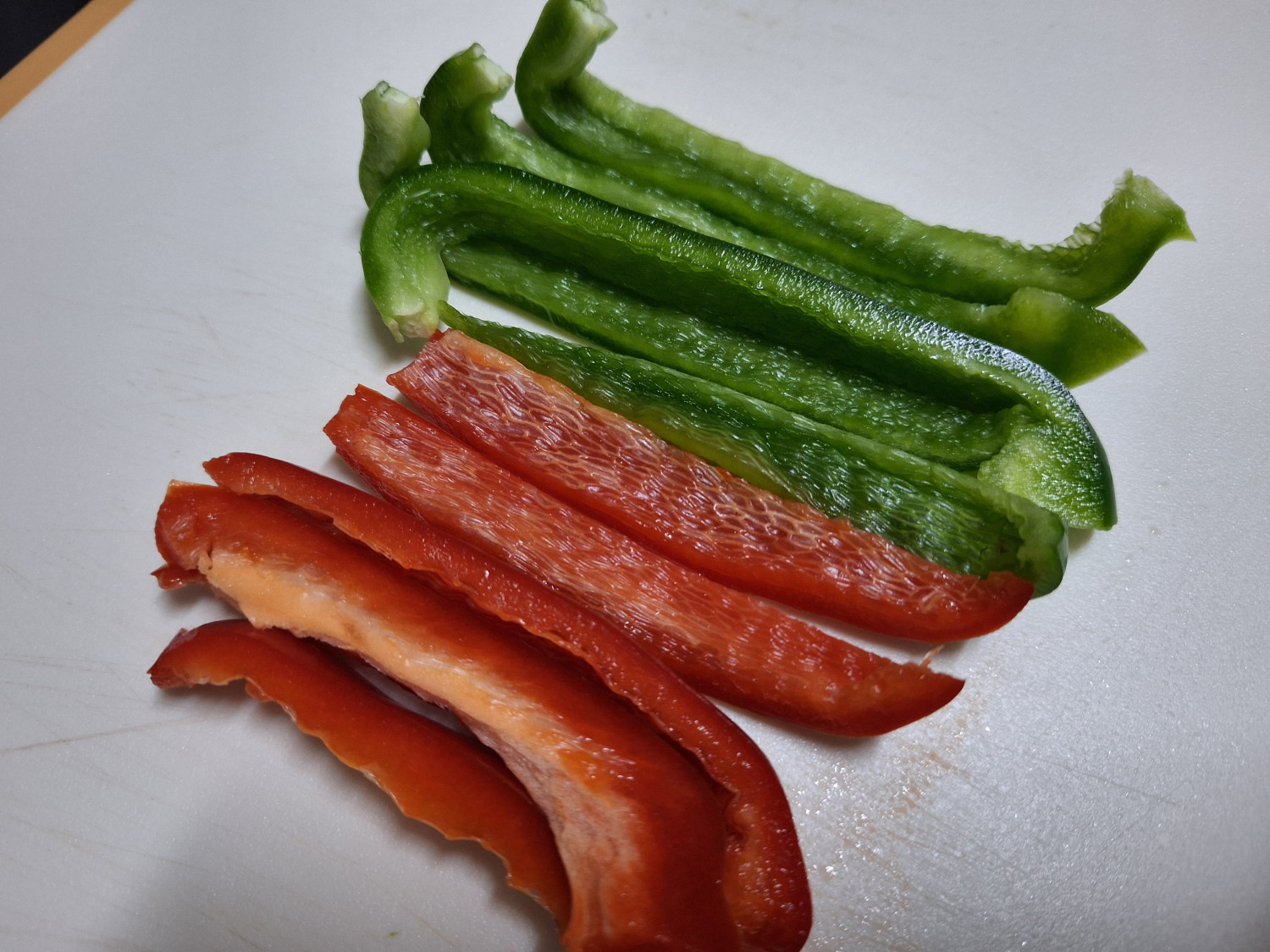 라이스페이퍼 6 장 , 피망 6 조각 , 빨간파프리카 6 조각 , 깻잎 6장 , 칠리소스 2 숟갈