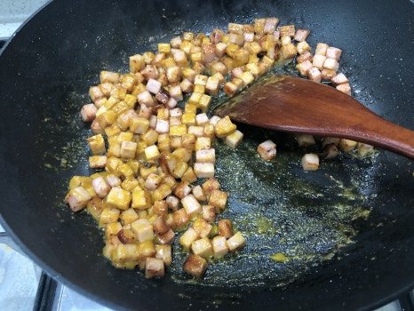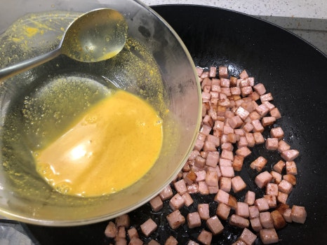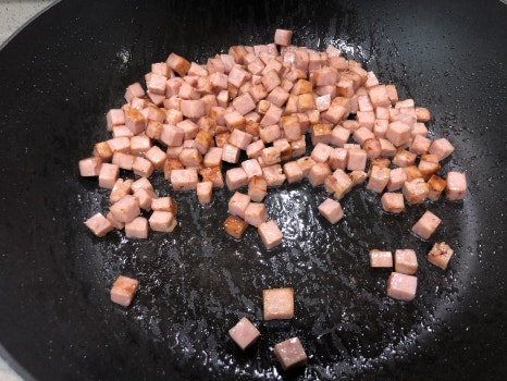 손질된 햄을 넣고 노릇노릇하게 익혀 줍니다.