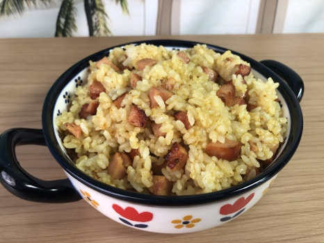 햄이 노릇해지면 준비된 카레소스를 넣고 불을 약불로 줄여서 한번 볶아줍니다.