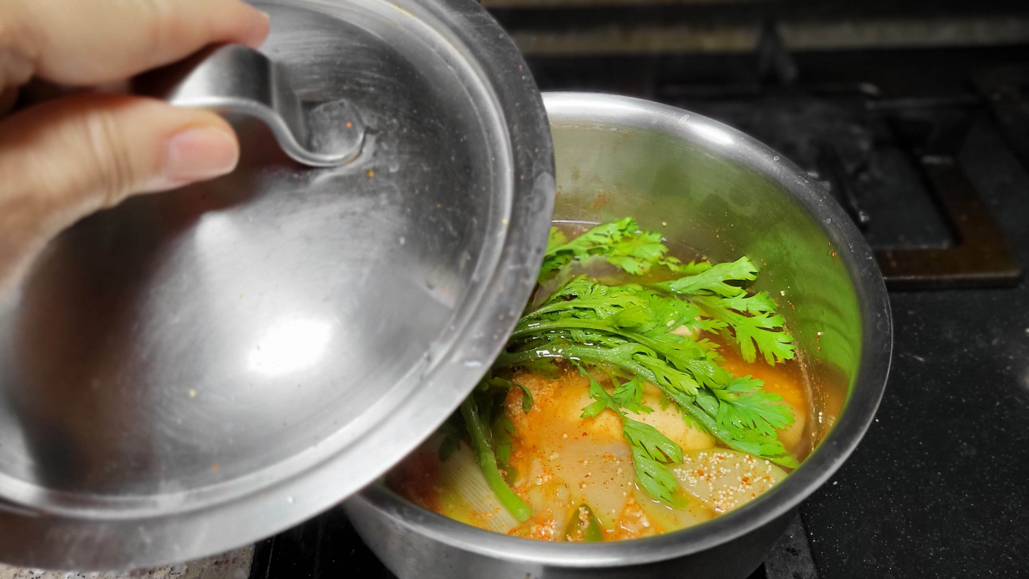 쑥갓은 넣고 끓여도 조지만 불을 끈 다음 넣고 뚜껑을 닫아도 충분히 익는다.